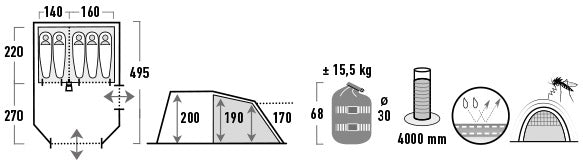 The entrance to the blister allows you to lay the electrical cable in the middle of the tent during the hour of staying in the camping camp. Small steel pins with a diameter of 5 mm are intended for hard soil. Taped seams guarantee tear resistance and waterproofness.