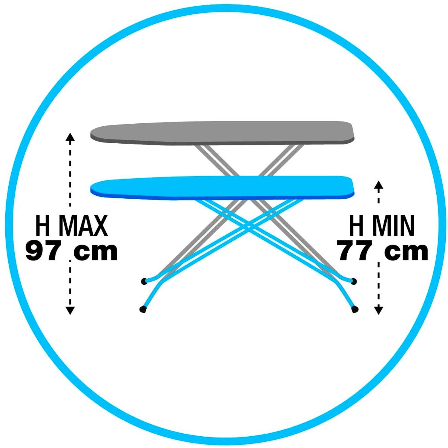 The surface of the board has a continuous perforation on the mesh base. Due to this design, the steam of the spray passes through the board itself, thereby eliminating the accumulated condensate under the cover. The rounded end of the board allows you to iron important areas in shirts and blouses. The cover is important, in the world, it can be removed or replaced with a new one. The suction board can be adjusted in height smoothly and without much effort for maximum comfort. There are soft covers on the legs to protect the board from shoeing.