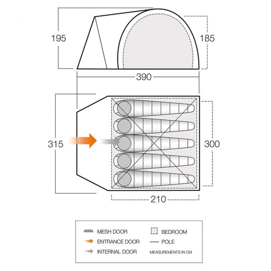 | Manufacturer code: 928165 Parameters: Product status BN_NAL: CAL Warranty: 12 months Country of brand registration: Great Britain Country of origin: China Package dimensions: 70 x 25 x 25 cm Dimensions: 390 x 315 x 195 cm Weight: 9.8 kg Packaging: Carrying case bag Purpose: 5-person tent Features: Darkened sleeping area 210 x 300 cm Spacious vestibule with removable floor 2 windows Floor: Polyethylene (polyethylene) Inner tent: Breathable Polyester Outer awning: Protex® Shield, 3000 mm H2O Equipment: Inner tent, outer awning, cover bag, flexible poles, pegs, guy ropes Frame: Vango Powerflex® fibreglass arches Availability of vestibule: Yes Capacity: Five seats or more Construction: Double layer Purpose: Camping Shape: Hemisphere Type: Tents