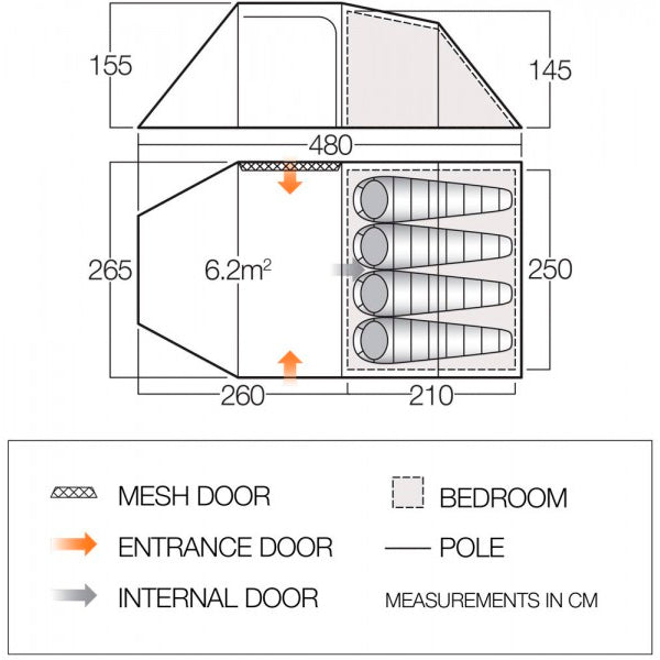 - Outer tent (LxWxH), mm: 4800 x 2650 x 1550