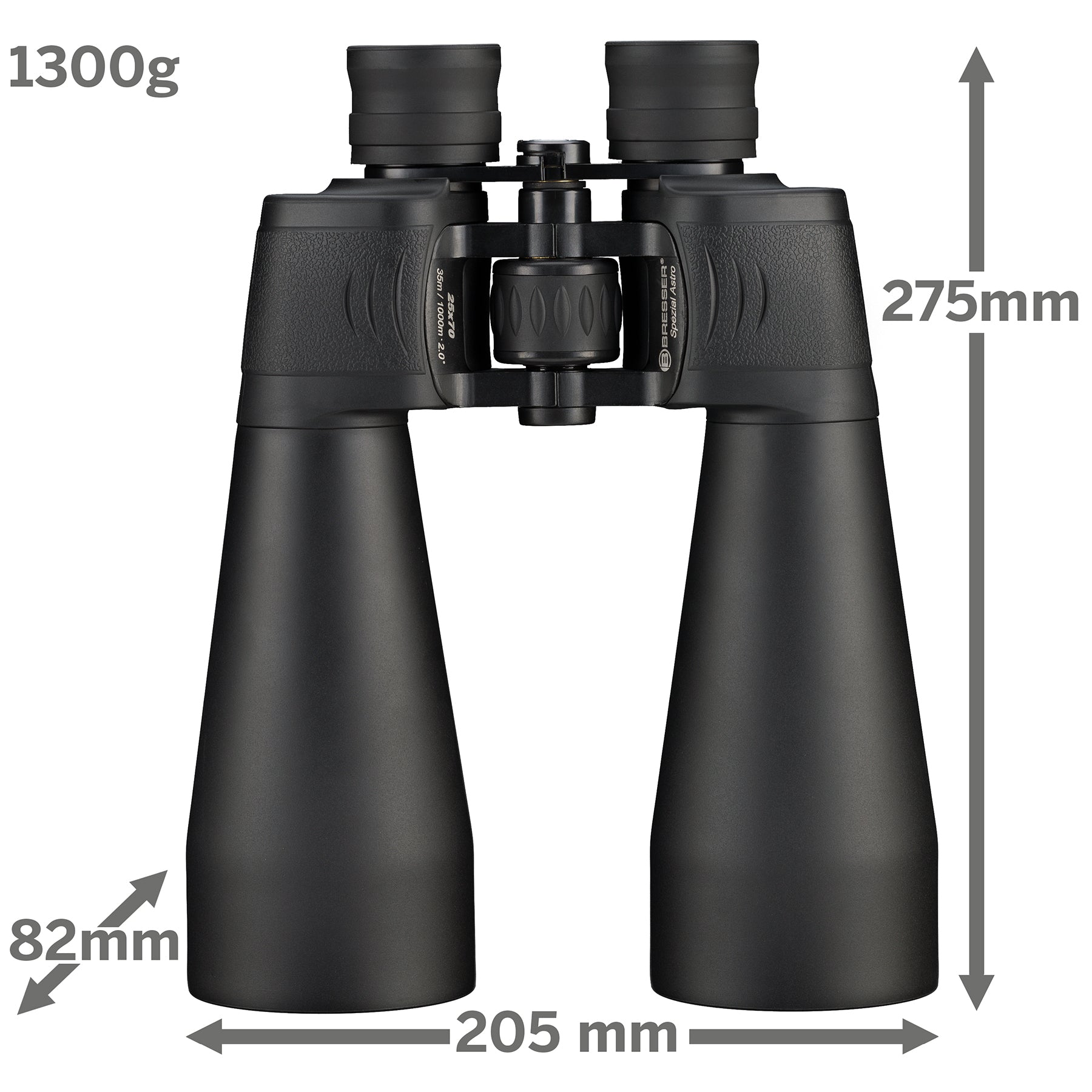 | Manufacturer code: 927552 Parameters: Color: Black Warranty: 12 months Brand registration country: Germany Country of origin for product: China Weight: 1300 g Dimensions: 275 x 205 x 82 mm Material: Aluminum with humic coating Prism material: BAK4 Additional characteristics: Interaxial adjustment, mm: 56-72 Diopter correction: -5/+5 Luminosity: 7.84 Class: Astronomical Outlet diameter: 2.8 mm Sutinki factor: 41.83 Minimum focusing distance: 10 m Real kut zor: 2° Vinesen ocular point: 17mm Eyepiece Frames: Fold Down Tightness of the structure: Breezproof Defender: Shockproof Field of view at 1000 m: 35 m Zoom ratio: 25x Type of increase: Continuous Construction type: Porro Type: Binoculars EAN code: 4007922058924 Item: 927552 Brand: Bresser Package weight: 1.6 kg Color: Black Lenses: Fully Multi coated Maximum gain:: 25