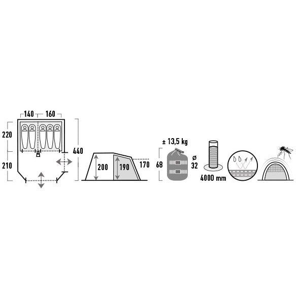 High Peak Meran 5.0 Light Grey/Dark Grey/Green (11808) is a five-piece family tunnel lining with two entrances and a fabric with a sewn-in lining, which will provide protection against annoying lumps and careless tractions. The living area with a height of 2 m provides sufficient space for placing camping tables, tables and general storage. Two-part doors increase the flow of fresh air and prevent coma. The windows in the living area should be filled with light, and the curtains should be adjusted if necessary. It has a thermally inflatable aluminized coating, which reduces the temperature rise in the middle of the day during sunny weather.