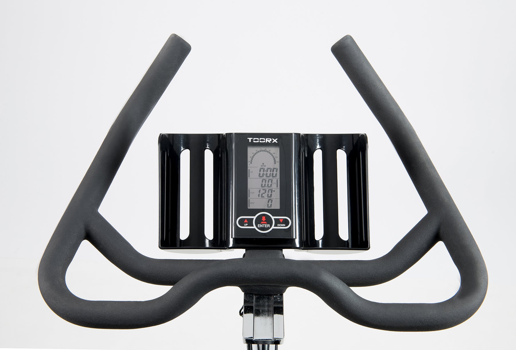 Cycle trainer Toorx Indoor Cycle SRX 75 (SRX-75) from the Italian manufacturer Garlando SpA for intensive cardio training at home. The simulator has a shoe pressure system with manual stepless adjustment of tension, as well as a computer with the necessary set of functions. An important 22-kilogram flywheel, combined with a belt drive, ensures quiet operation of the simulator and is sufficiently important for training athletes. The spin bike is rated for a weight of up to 130 kg and is suitable for riders up to 2 m in height. The use of a device for a drone-free pulse sensor will be accurate to the hour of training to control the heart rate quickly. The sports seat and cushion are adjustable in height and horizontal width, ensuring individual adjustment. Transport rollers in the front part of the simulator allow you to easily move it around the room.