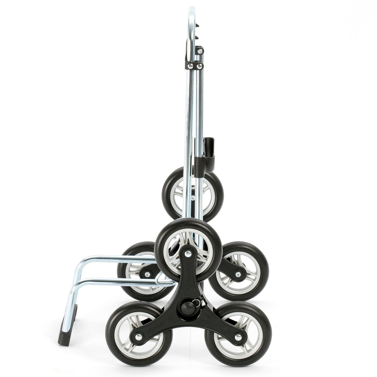 • The steel Treppensteiger Scala is equipped with a six-wheel system with wheels with a diameter of 13 cm and has a lifting capacity of 40 kg. Thanks to a simple fastening system, the wheels can be easily removed and washed. Everything you need to do is pressed onto the metal retainer on the wheel. Large diameter wheels are suitable for uneven terrain and easy wheel alignment.