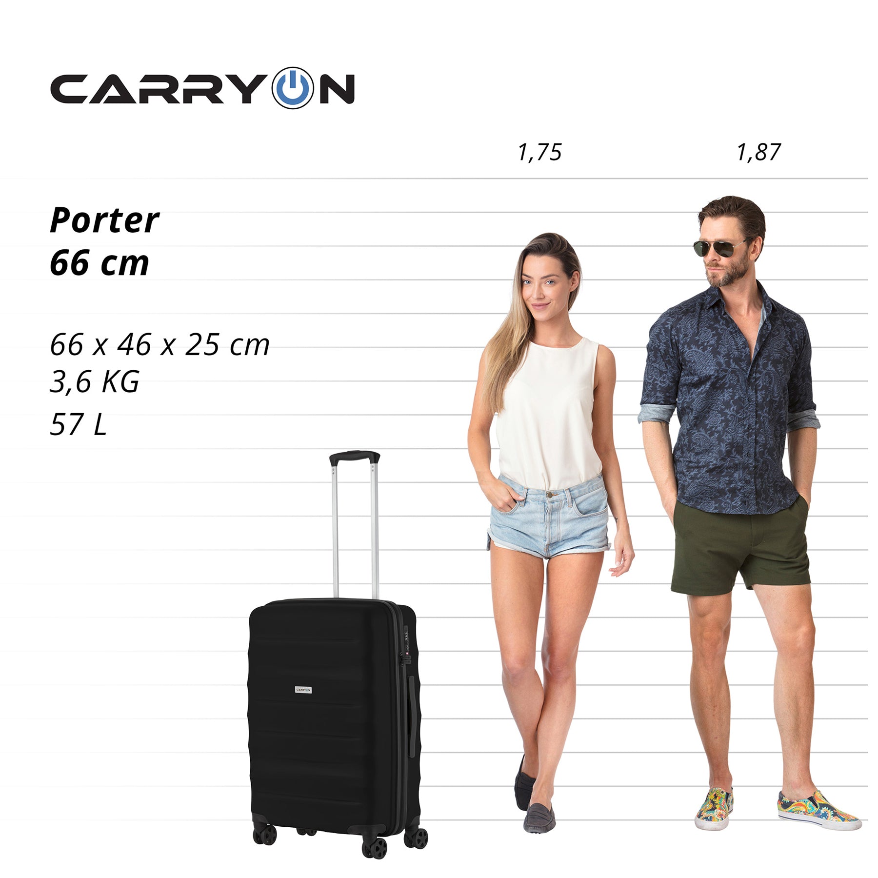 With a combination lock Country of registration of the brand: Netherlands Warranty: 12 months Dimensions: 66 x 46 x 25 cm Color: Black Weight: 3.6 kg EAN code: 8717253524444 Item: 930029 Brand: CarryOn Size: Medium (51 - 89 l) Body material: Polypropylene Package weight: 3.9 kg Package dimensions: 68 x 48 x 27 cm
