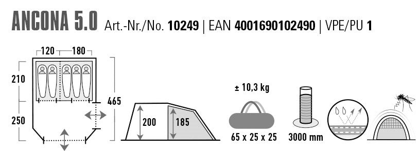 High Peak Ancona 5.0 Light Grey/Dark Grey/Green (10249) - a five-piece tunnel cover for families and tourists who value comfort. The spacious living area in the rainy day allows you to accommodate all your speeches and gather in the middle in rainy weather. The presence of two entrances requires manual access to the tent. The front openings of the windows in the living area will fill the interior with light, and the curtains will be adjusted as necessary. The side window often provides greater additional ventilation from the curtain. A wide, darkened bedroom with a dark partition guarantees a comfortable sleep not only at night, but also in bright sunshine. The ventilation system Vario Vent Control ensures regulation of the flow of fresh air in the interior. If it gets colder, just adjust your inner shutter. The door flap on the brisk is easily adjusted from the middle and neatly folds into a pocket for storage. Two front and thick ventilation windows are designed to ensure air circulation and reduce condensation. It has a thermally inflatable aluminized coating, which reduces the temperature rise in the middle of the day during sunny weather. Small steel pins with a diameter of 5 mm are intended for hard soil. Taped seams guarantee resistance to tearing and ensure waterproofness of the basting. The organizer and internal storage containers allow you to carefully store everything you need. This also marks the attachment point for the lighter.