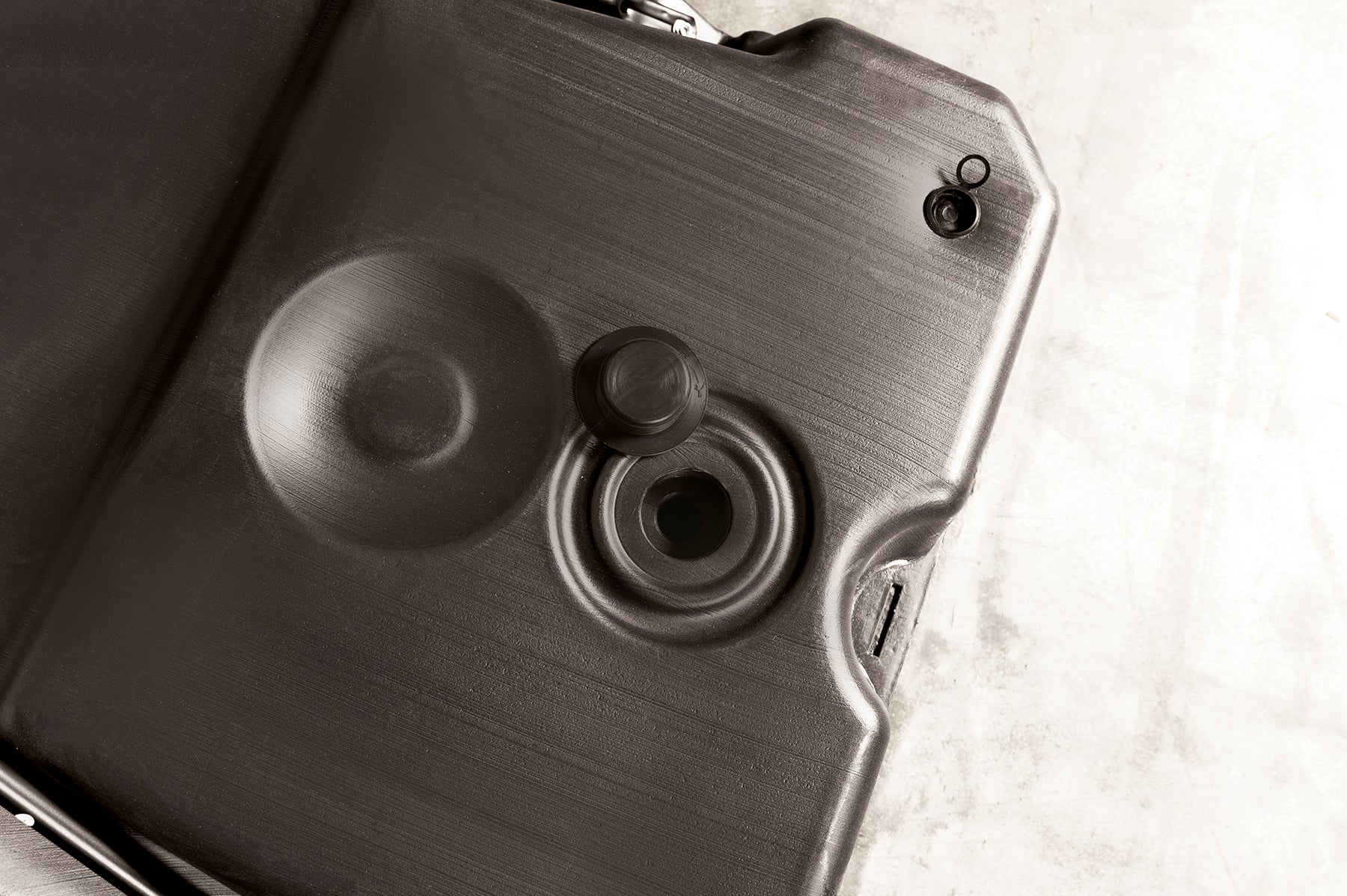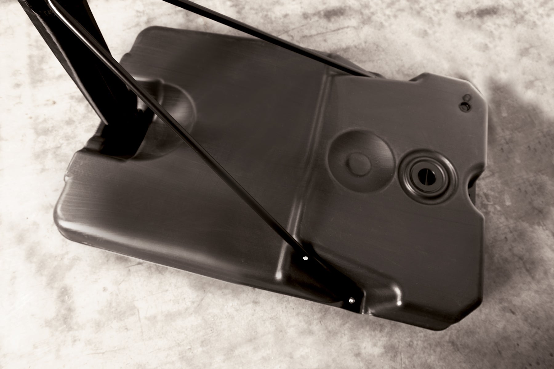 - The base is made of black molded polyethylene, equipped with wheels at the front, and can be filled with water to ensure durability under heat.
