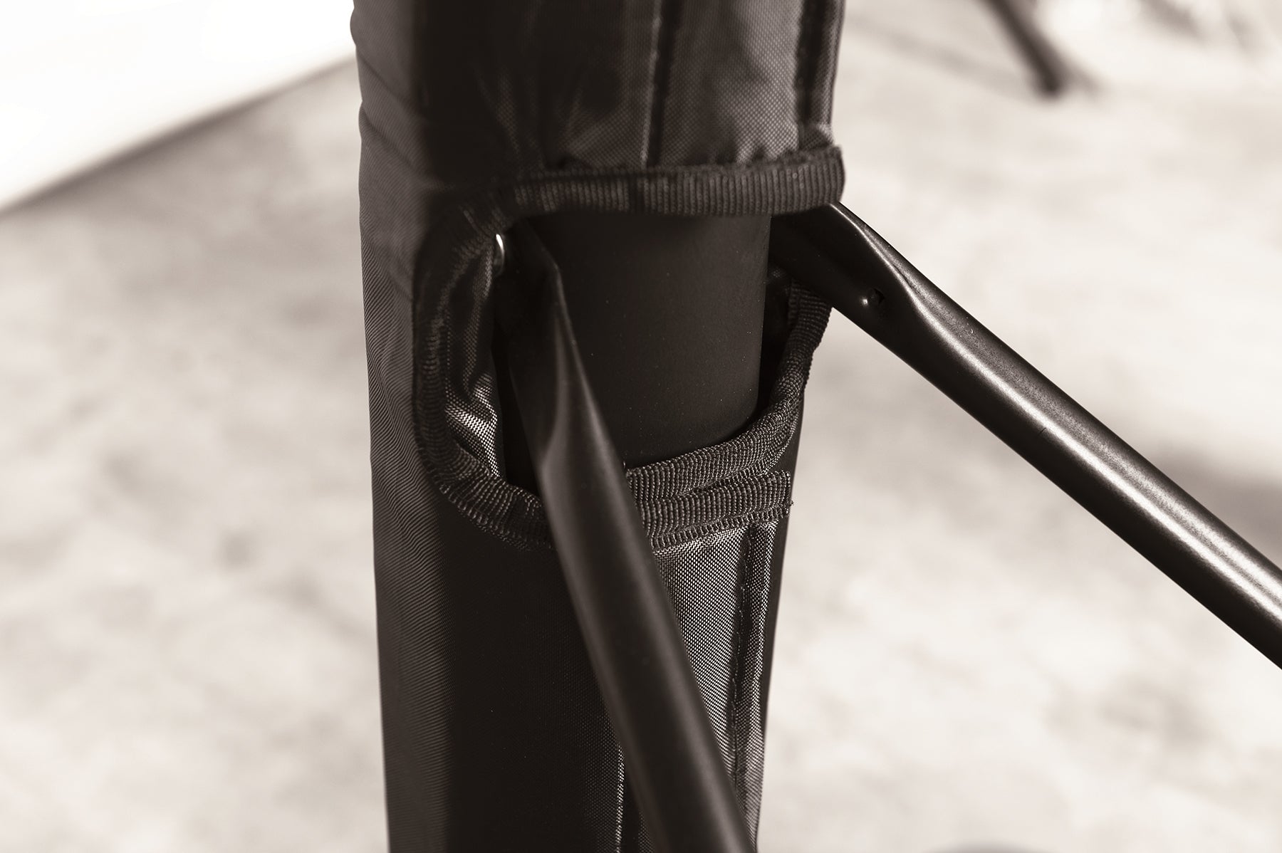 - Vertical structure with adjustable height, steel telescopic pipe Ø60 mm and reinforced fasteners, coated with black colored powder coated tarpaulin.