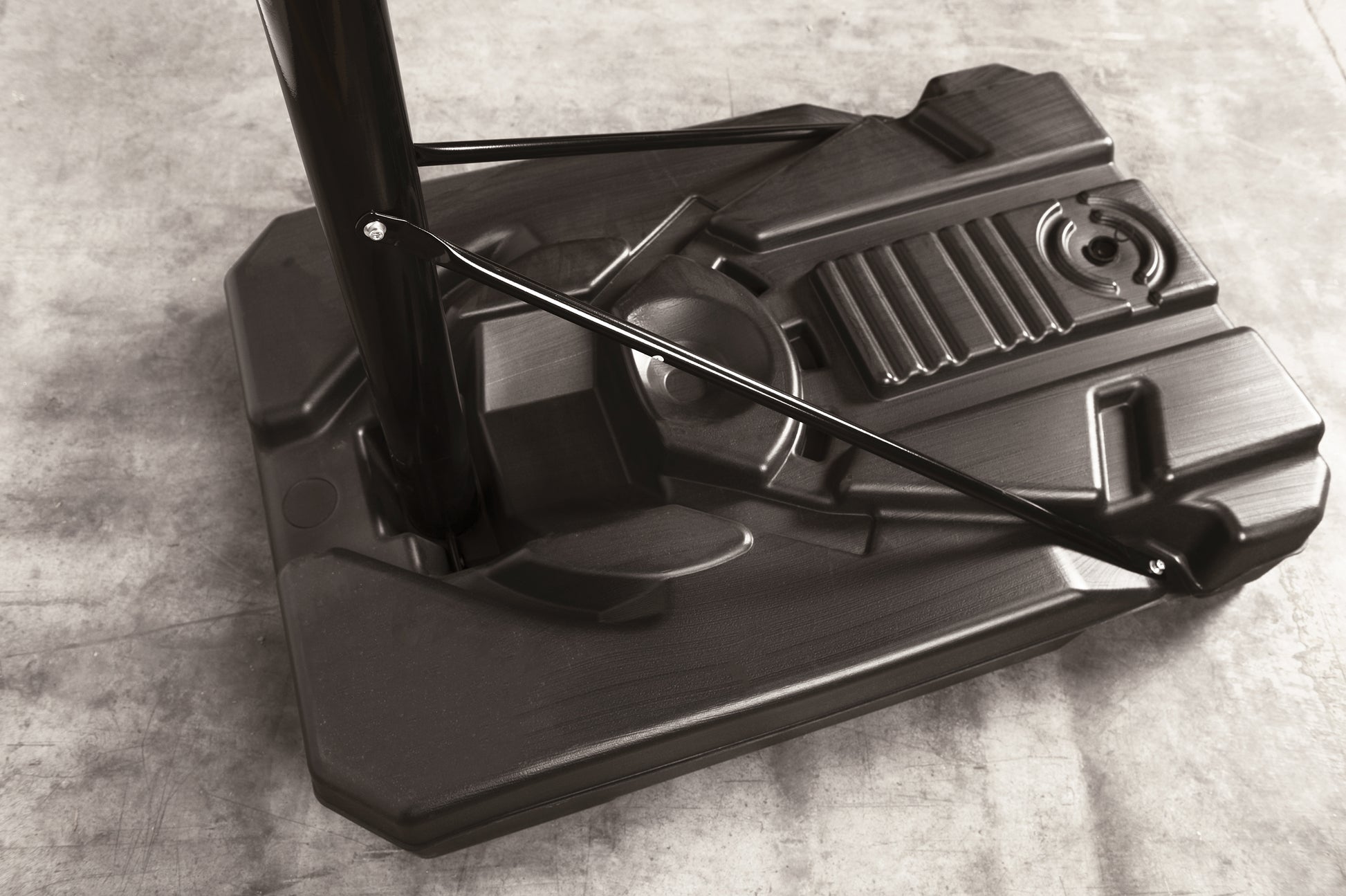- The base is made of black molded polyethylene, equipped with wheels at the front, and can be filled with water to ensure durability under heat.