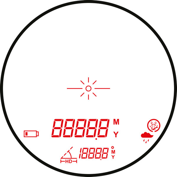 - HUNT - for calculating the real distance to an object in the open air during the hour of watering, without irritation. Ignoring the interference that occurs when passing the laser through grass and other bushes. This mode is red for long distances to large targets, such as a deer that moves among bushes, trees and grass. In this mode, a pictogram of a deer near the kitchen is displayed.