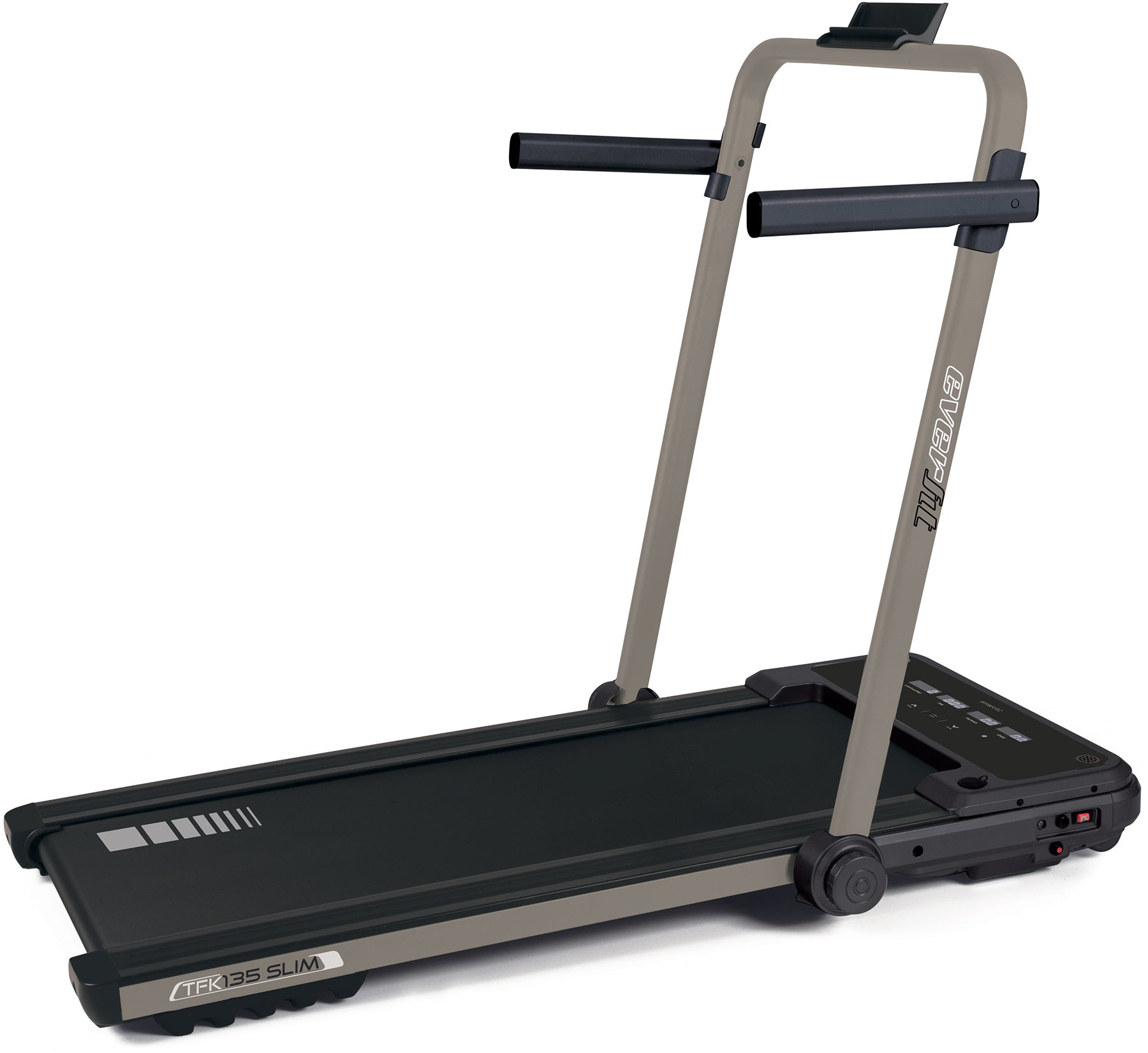 The Everfit Treadmill TFK 135 Slim Pure Bronze (TFK-135-SLIM-B) treadmill from the Slim Line of the Italian manufacturer Garlando SpA is intended for race walking and running at home. The model is equipped with a front-mounted frame and transport rollers, which makes it easy to move around the apartment. The treadmill is easy to operate, has a modern elegant design and excellent technical characteristics. The stress training simulator has a maximum capacity of up to 90 kg and allows you to develop speed from 0.8 to 8 km/year. A running belt measuring 112 x 40 cm is sufficient for training for athletes up to 180 cm in height. A large display with white LED screens is located on the motor panel, where you can view the information about speed, distance, hour, calorie consumption and time. The Everfit Treadmill TFK 135 Slim Pure Bronze (TFK-135-SLIM-B) treadmill includes a smartphone/tablet stand, large handrails for extra safety, a remote control, and built-in speakers for Connection via Bluetooth and automatic system for washing the running belt.