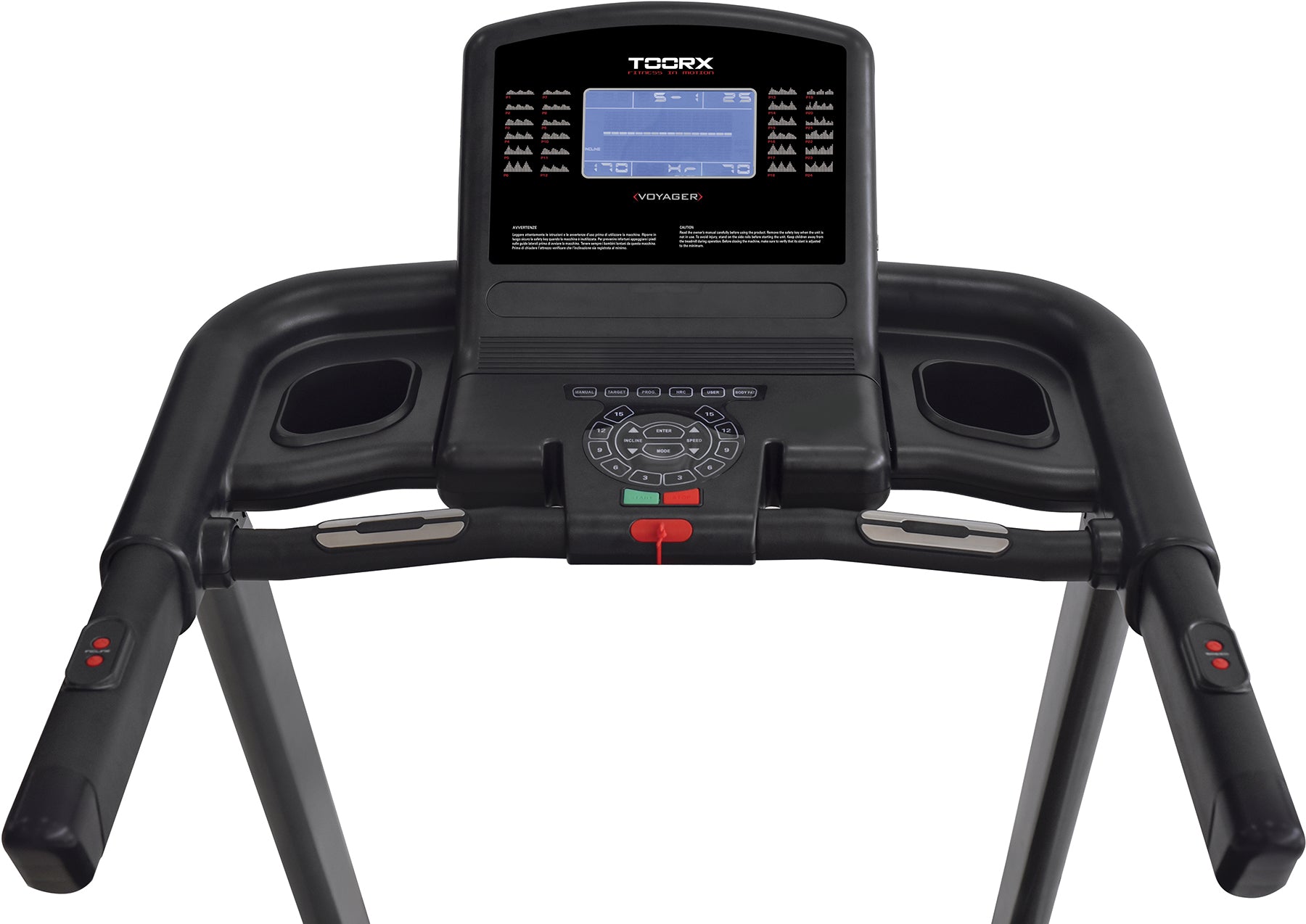 The Toorx Treadmill Voyager (VOYAGER) treadmill from the Italian manufacturer Garlando SpA is designed for sports walking and running at home. The model is insured for a maximum load capacity of up to 120 kg and has a powerful steady-state engine of 2.75 hp, which allows the development of speed from 1 to 18 km/year. The woven fabric measures 141 x 48 cm and it is possible to adjust the tension from 0 to 15% using the buttons on the bath panel or using the buttons located on the handrails. The Soft Tech shock absorption system reduces stress on the angle and minimizes the risk of injury during the exercise. The simulator console with an LCD display and black backlights is equipped with a variety of programs both for the preparation of crustaceans and for cobs. The included touch sensors will monitor your heart rate during the hour of training in one of the four heart rate programs. The Toorx Treadmill Voyager (VOYAGER) treadmill has a foldable design and transport rollers, which makes it easy to move around the apartment.