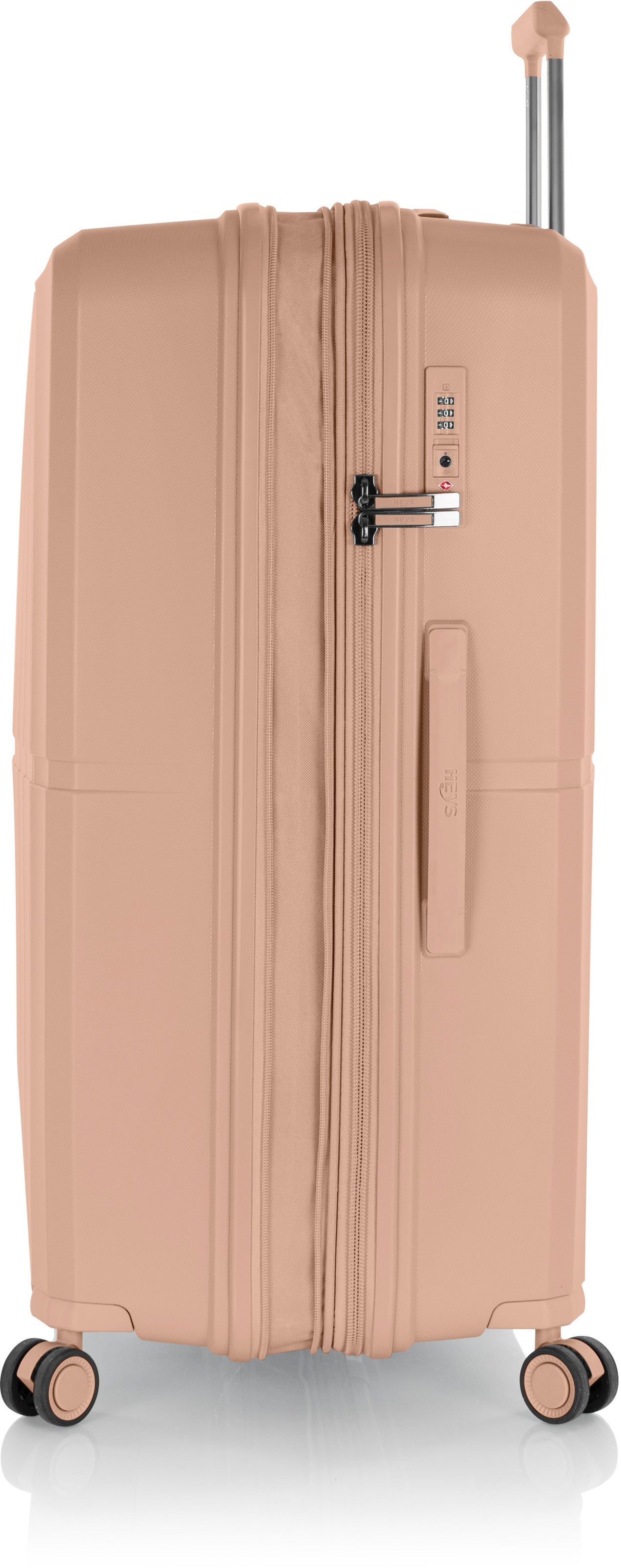 On 4 wheels Country of registration of the brand: Canada Country of origin for product: China Warranty: 12 months Dimensions: 76 x 50 x 30.6 cm Color: Nude Weight: 3.9 kg EAN code: 665556050796 Item: 930373 Brand: Heys Size: Large (90 liters or more) Body material: Duraflex Package weight: 4.5 kg Packaging dimensions: 80 x 55 x 35 cm