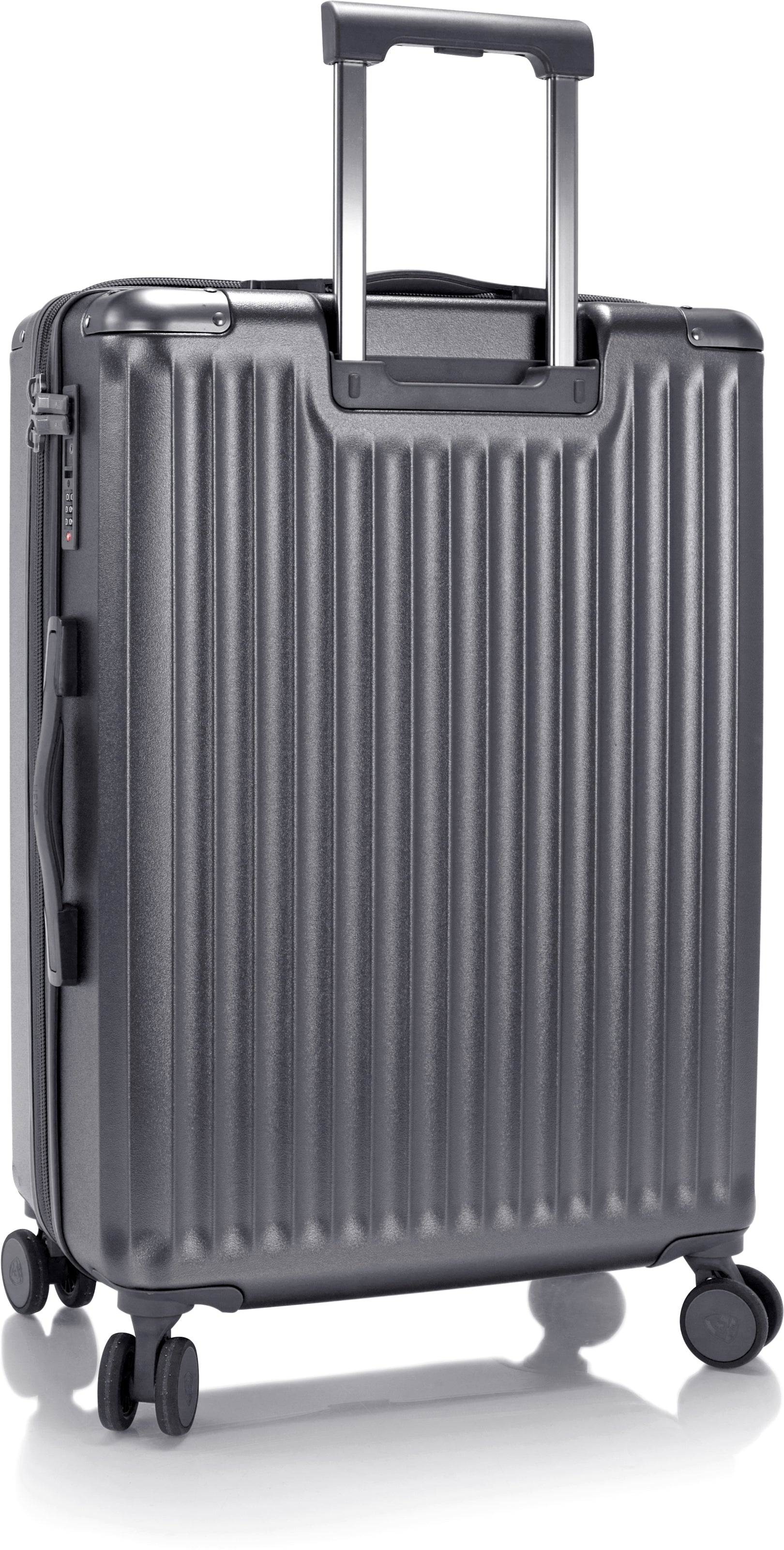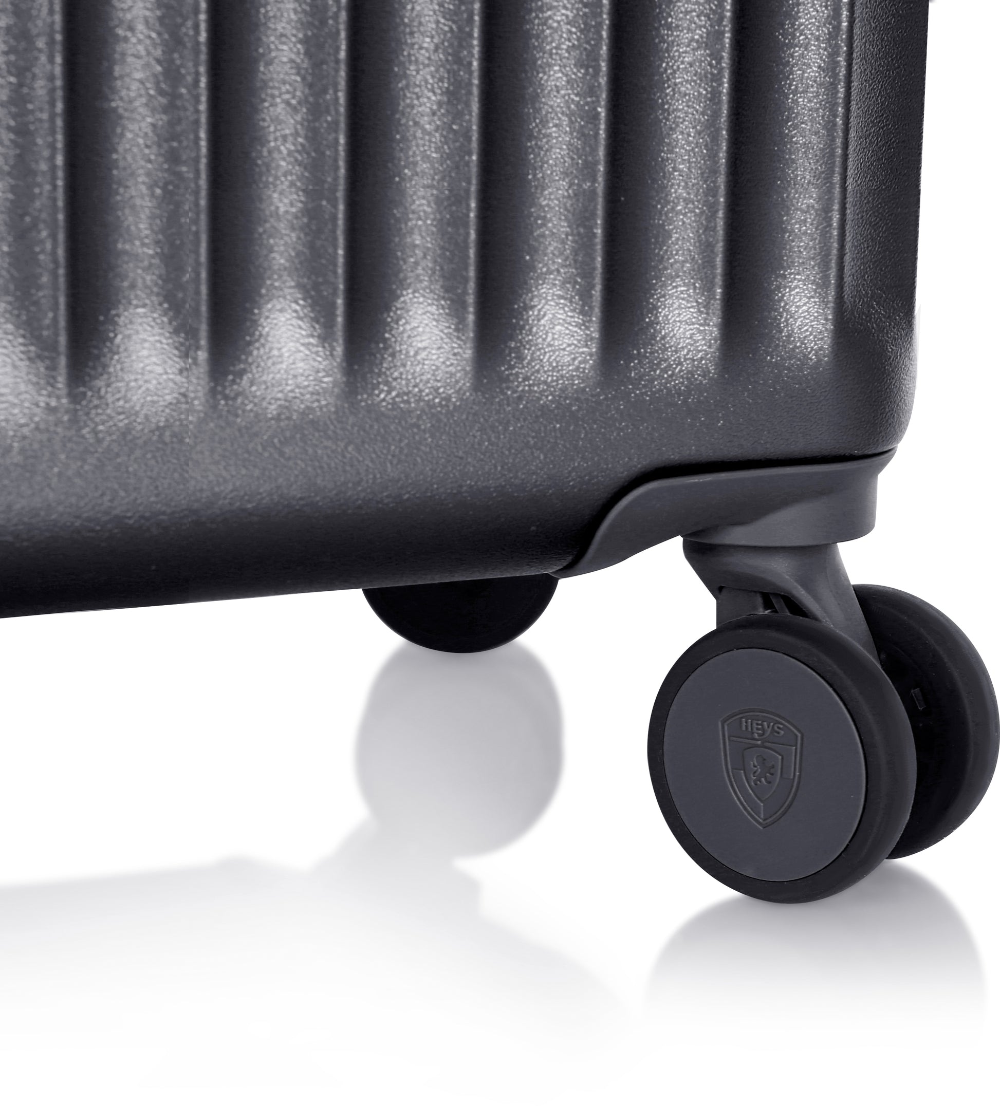 On 4 double wheels Country of registration of the brand: Canada Country of origin for product: China Warranty: 12 months Dimensions: 66 x 45.7 x 27.9 cm Color: Gunmetal Weight: 4.1 kg EAN code: 665556051267 Item: 930389 Brand: Heys Size: Medium (51 - 89 l) Body material: Polycarbonate