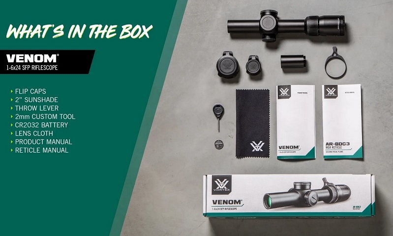 Optical sight Vortex Venom 1-6x24 SFP AR-BDC3 MOA (VEN-1601) is a replacement for a similar sight in the Strike Eagle 1-6x24 AR-BDC3 (MOA) (SE-1624-2) series, which is used for production. The sight is designed for precise shooting at close and medium distances and has a magnification magnification of 1-6x. The aiming mark is moved to a different focal plane, which means that its scale is no longer unchanged when the magnification is changed. The body is made of aluminum covered with anodized coatings, resistant to mechanical damage.
