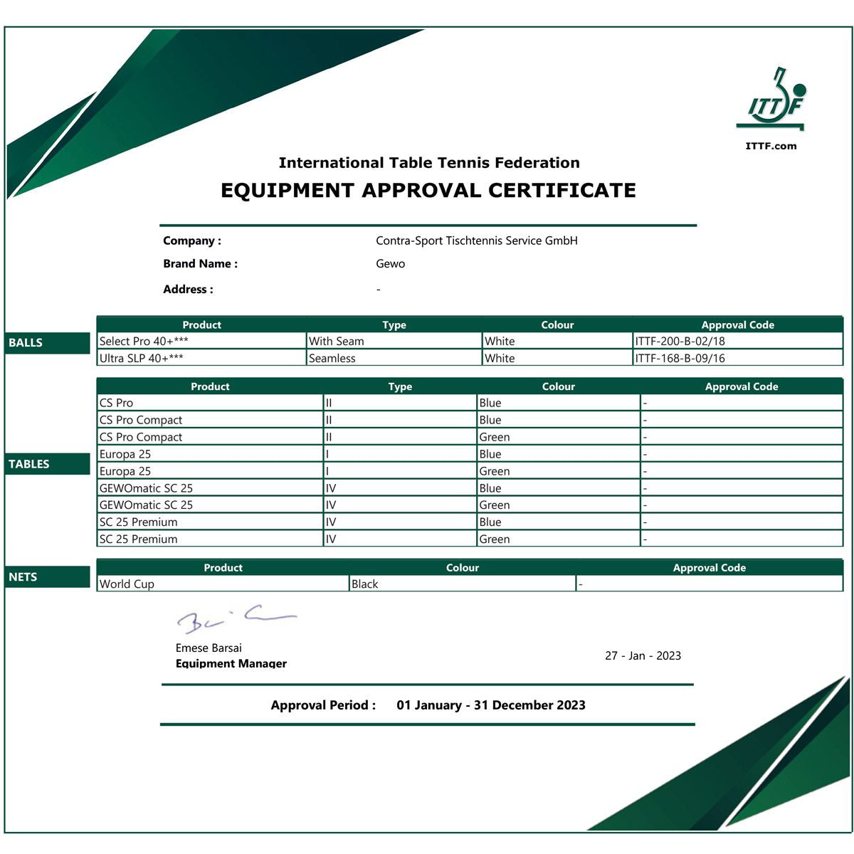 Standards, certificates : certified by ITTF (International Table Tennis Federation)