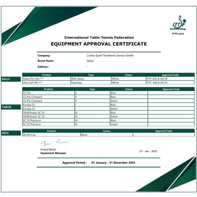 The Gewo Europa 25 ITTF table meets class A of the European standard 14468-1. The 25 mm thick liner ensures optimal tightness. The playing surface undergoes preliminary processing in a number of main stages and removes a special varnish that is applied during the casting process. This special varnish guarantees a high friction coefficient with a very low shine level. The game lines, applied using a stencil, are even thin and imperceptible, reaching the very gaming authorities on the gaming surface. The table has a frame with legs and a practical folding mechanism, which will simplify installation and dismantling. There are also two large transport rollers on the skin half of the table for easy vertical transport. The table tennis table Gewo Europa 25 ITTF is 100% manufactured in Germany and is licensed by the International Table Tennis Federation (ITTF).