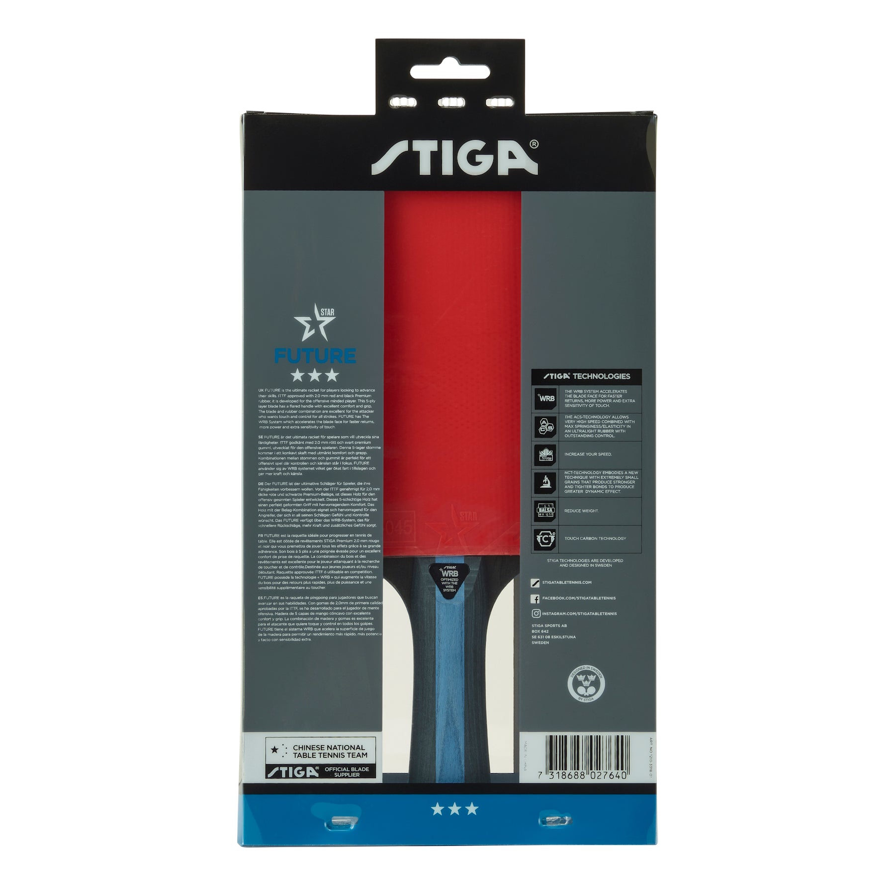 The Future 3-star table tennis racket from STIGA is a great choice for attacking players who want to develop their skills. The 5-ball blade is made with ITTF approved 3-grit rubber and 2mm jaws, which ensure greater control and precision. WRB technology provides increased flexibility, strength and feel, and the angled handle ensures a handy and secure grip. Develop your skills and perfect your game with the Future table tennis bat from STIGA.