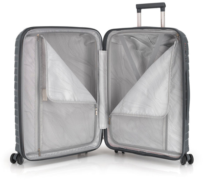 With a combination lock Country of registration of the brand: Spain Country of origin for product: China Warranty: 12 months Dimensions: 66 x 44 x 27-30 cm Color: Gris Weight: 3.5 kg EAN code: 8425126251273 Item: 931376 Brand: Gabol Size: Medium (51 - 89 l) Body material: Polypropylene Package weight: 3.8 kg Package dimensions: 68 x 50 x 30 cm