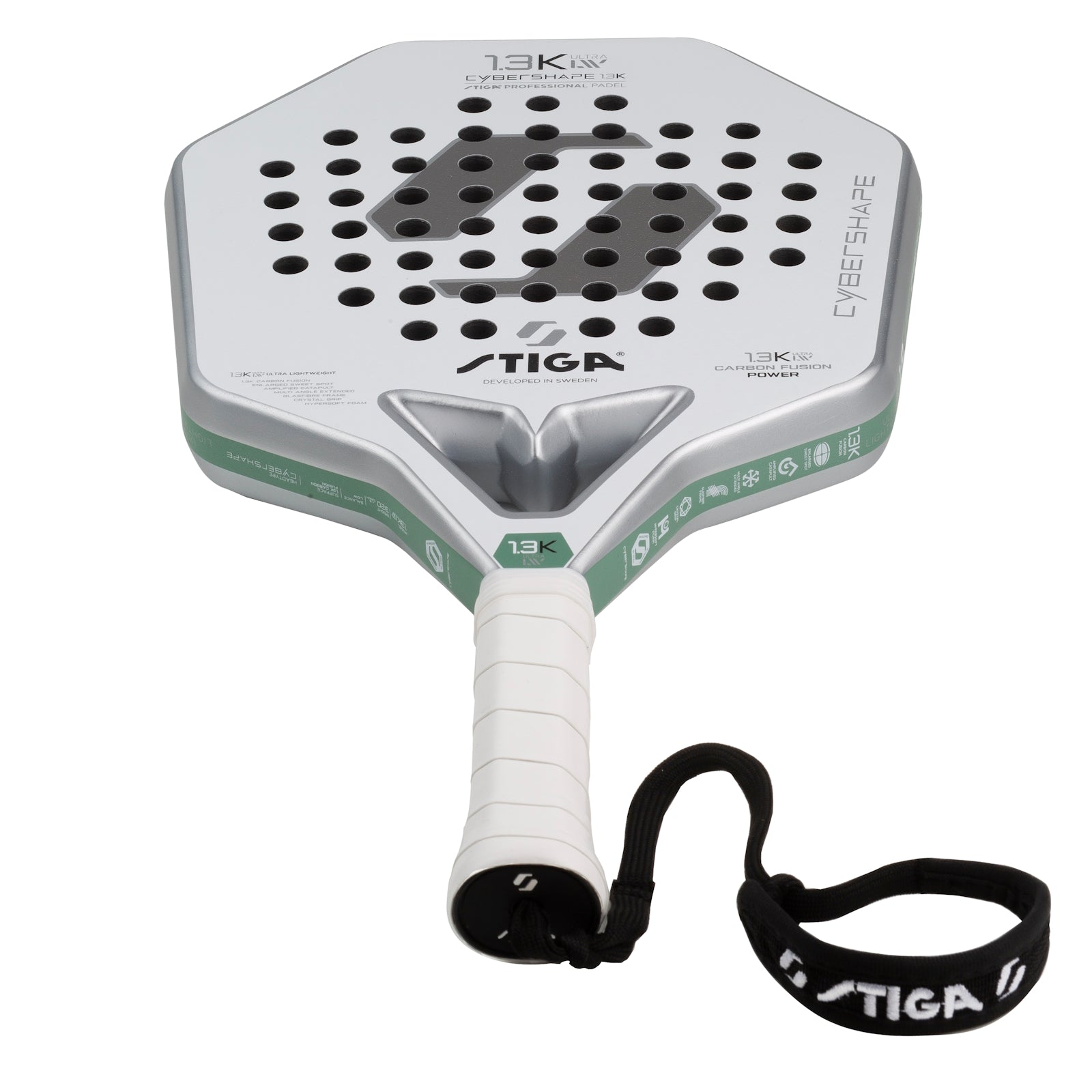 The STIGA 1.3K Ultra LW Cybershape pad tennis racket is an innovative 2025 model, designed for intermediate players who want to improve their technique and ball control. Featuring a unique six-layer Cybershape shape, this racquet provides a 20% larger sweet spot at the top of the head and 12% less support and is in line with traditional round models. The outer ball of the racket is made of 1.3K Carbon Fusion , a thin ball of carbon fiber, which together with the fiber creates a miracle combination for those who want to achieve excellent ball control and feel when hitting. The frame is made from fiberglass to eliminate strong vibrations and ensure a smooth strike on the ball. The padded handle provides additional comfort and support, as well as plenty of space for left-handed strikes with both hands. The wonderful surface of the Crystal Grip allows you to easily handle the ball.