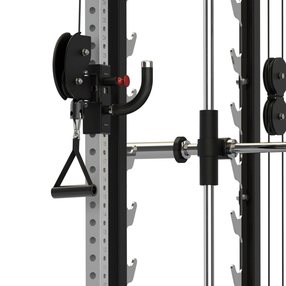 Universal 3-in-1 trainer: Includes a 3D Smith machine, a pulley block trainer and a power rack.