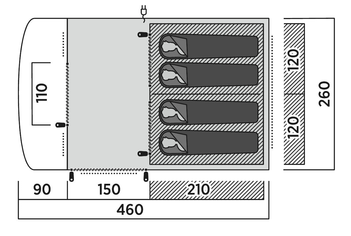 Skarvan 4 tarpaulin is a spacious family tunnel tarpaulin for 3-4 individuals, divided for comfort and practicality. Separated bedrooms with buttons ensure privacy, while the SleepTight system, with dark materials and optimal ventilation, promotes restful sleep.