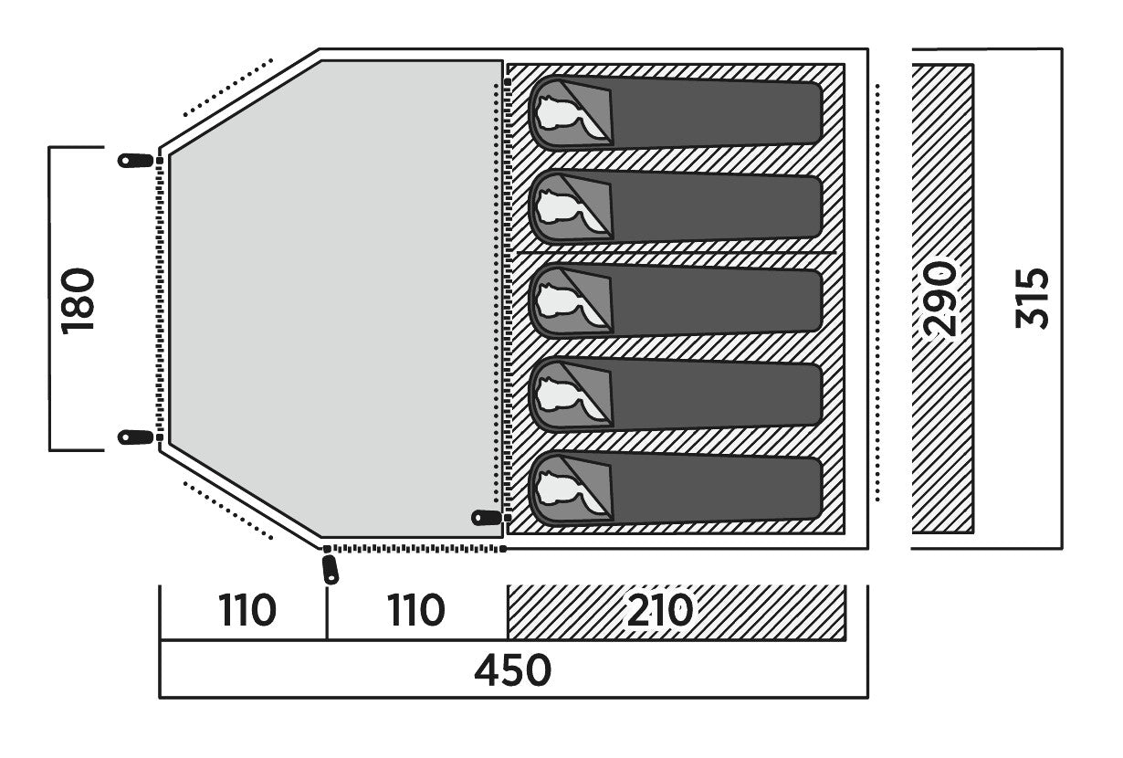 The Hidra 5 has a tunnel design, ideal for a variety of uses. It has a large veranda with generous cover and two doors for greater versatility. Enjoy windows on both sides with curtains, closed front and rear ventilation and controlled wind flow. The internal SleepTight lining ensures a comfortable sleep early in the morning and early in the evening, and the standing height in the living area adds additional comfort.