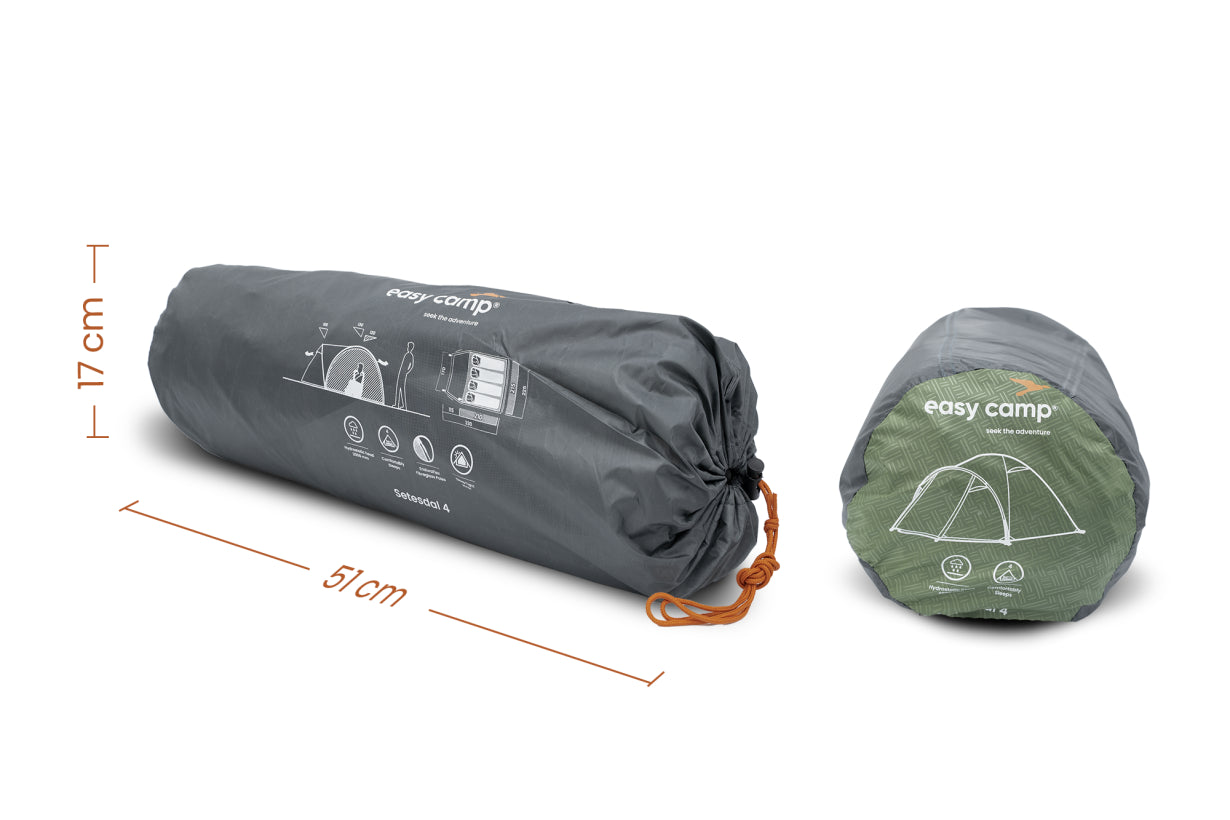 | Manufacturer code: 931549 Parameters: Brand: Easy Camp Product status BN_NAL: BG Warranty: 12 months Country of registration of the brand: Denmark Country of origin for the product: Bangladesh Package dimensions: 51 × 17 cm Dimensions: 330 x 130 x 225 cm Weight: 4.6 kg Packaging: Carrying bag Season: Three-season Substrate: Polyethylene Internal lining: Breathable Polyester Outer awning: WeatherGuard 2000, 180T PU-coated polyester, PFC-free, waterproof Equipment: Internal tarpaulin, external awning, arches, cords, cords, instructions, bag-cover Frame: EnduraFlex fiber 7.9/8.5 mm Locality: Chotirimisni Construction: Double-ball Purpose: Trekking Form: Pivsphere Type: Nameti EAN code: 5709388144706 Waterproofness: 2000 mm water. Art. Color: Green Height: 130 cm Item: 931549
