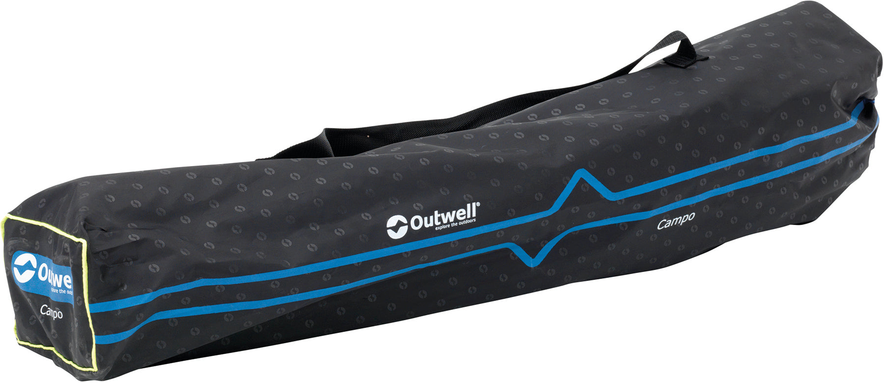 Outwell Campo Black (470233) - folding table with soft armrests and a removable cup holder. The frame is made of high-grade steel with powder coating and can hold up to 125 kg. Increased support of the legs improves stability on soft ground. The carrying case makes transportation easier and ensures more compact storage, as long as the cover is not damaged.