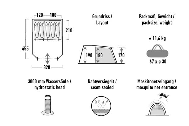 The High Peak Torri 5.0 is a spacious tunnel awning with clever features and flexible folding, suitable for families and small groups. Waterproof coating and sealed seams provide reliable protection no matter the weather. The stitched lining protects the worn-out timber, and the living area with a height of 2 m provides plenty of space for luggage and repairs. Two open windows with curtains and two full windows ensure daylight and privacy. Three systems of continuous ventilation and mosquito nets guarantee a welcoming climate in the living room - it can be kept up for an hour. Thanks to 5 internal cabinets, 5 organizers and a lamp tray, order and comfort are also ensured. The important partition is to break the internal tent of the vikoristan. Ideal for holidays, weekend trips and festivals.