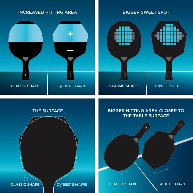 Більша зона удару ближче до поверхні столу - однією з відмінних особливостей конструкції Cybershape є те, що зона удару у поверхні столу збільшена до 6,5 см, у порівнянні з 2,5 см для круглого леза. Це дає вам більше шансів виконати короткі подачі та повернення.
