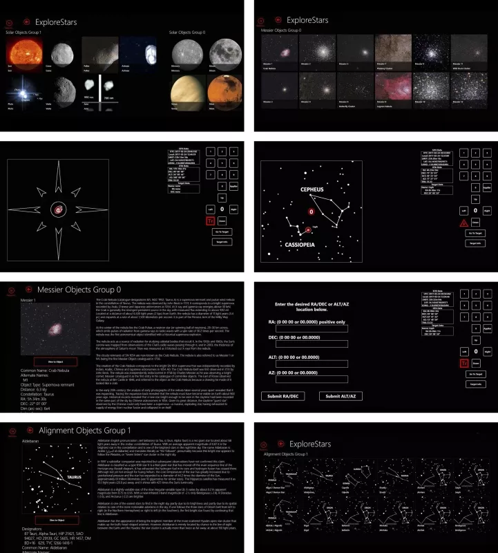 Інтерфейс програмного забезпечення має класичну схему з чотирьох кнопок для керування, центрування, переміщення та повороту на сенсорному екрані вашого планшета чи смартфона. Розгорнуті меню, які пропонують інтуїтивно зрозумілу процедуру вирівнювання, вибір різних каталогів, екскурсії, кнопку синхронізації, положення "паркування", функцію пошуку та екран введення координат для інформації RA та DEC. Цифрове меню дозволяє вибирати та вводити швидкість для повороту, центрування та наведення.