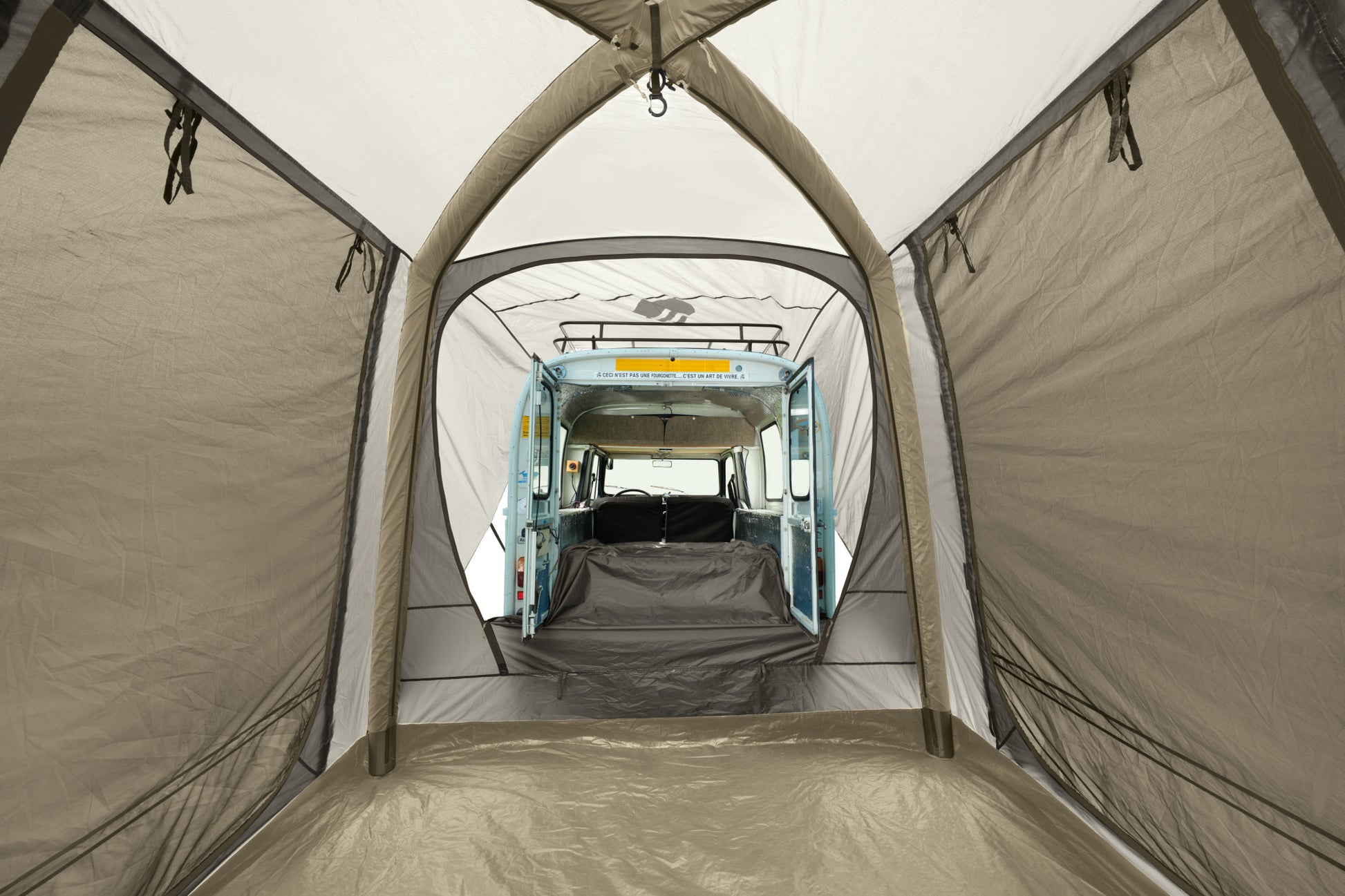 - Спосіб встановлення: внутрішній намет навішується на дуги за допомогою стрічок і застібок; зовнішній тент натягується та фіксується відтяжками