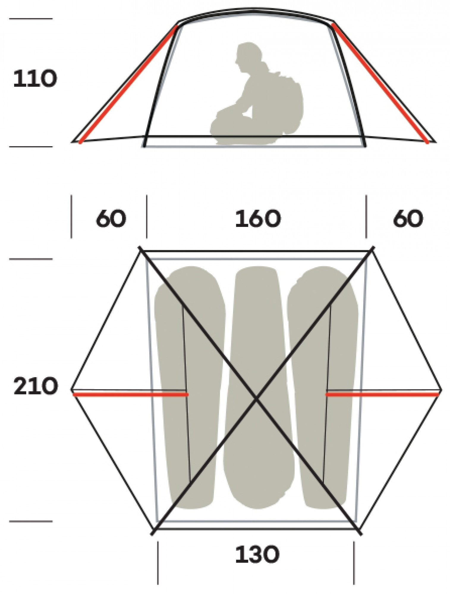 - Зовнішній тент: 70D Polyester Ripstop, 85 g/m² with Polyurethane Coating, FR Treatment (поліестер із поліуретановим покриттям та вогнезахисною обробкою), водостійкість 3000 мм