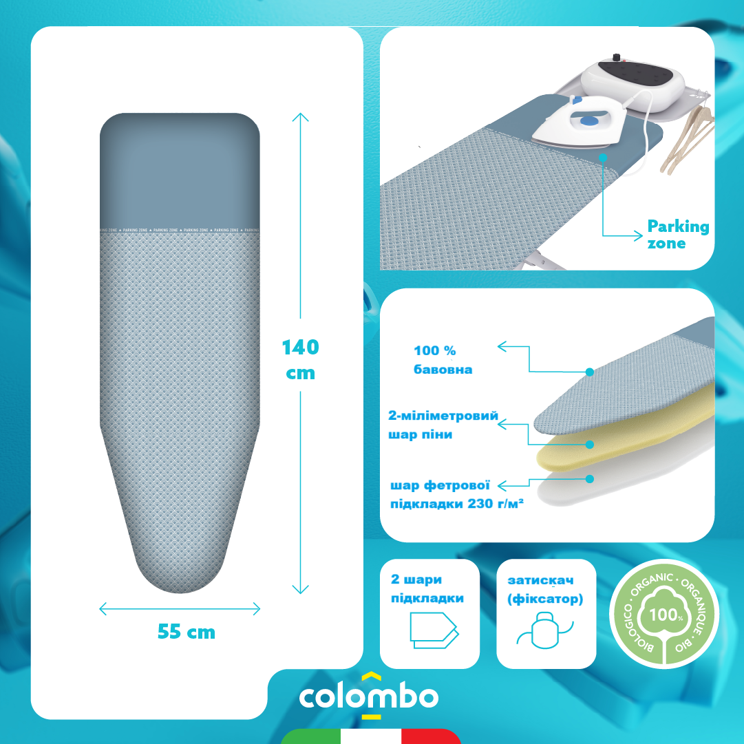 Чохол для прасувальної дошки Colombo Parking Zone (COP830) підходить для більшості стандартних та великих прасувальних дощок. Великий розмір (140 х 55 см) забезпечує повне покриття поверхні для комфортного прасування. Тришарова конструкція для максимального комфорту: поверхня зі 100% органічної бавовни, шар піни товщиною 20 мм та м'яка повстяна підкладка 200г/м2 для більш плавного прасування. Термостійка зона: включає безпечну зону паркування, де можна залишити гарячу праску, не пошкоджуючи дошку.