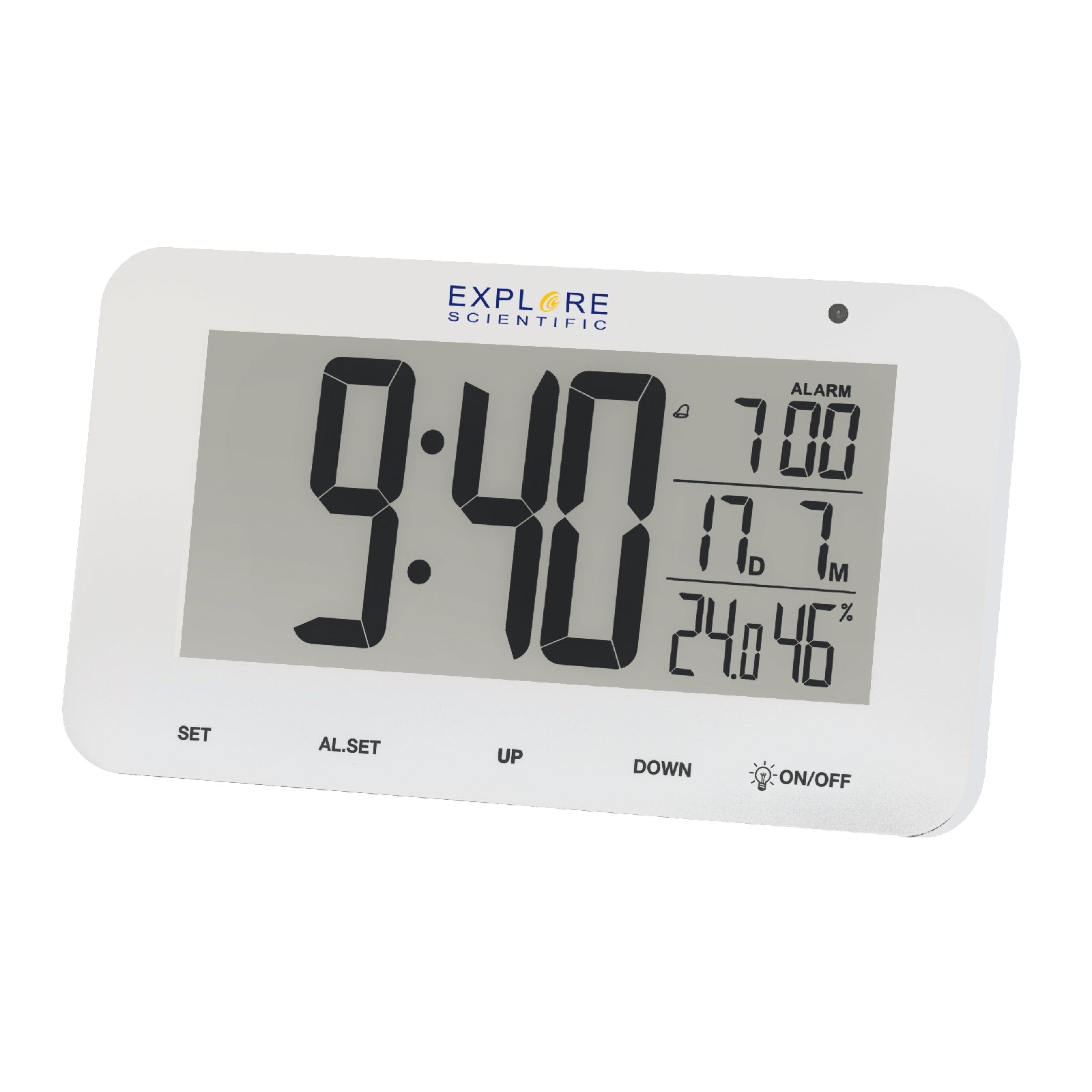 The Explore Scientific RC Alarm Table Clock features a backlight and a light sensor that provides a pleasant, more subdued backlight at night. The LCD screen displays the current time, alarm time, date, room temperature and humidity. Control and navigation through the menu is done using five touch buttons located under the display. Humidity and temperature indication helps to select the optimal microclimate in the room to protect against mold and mildew.