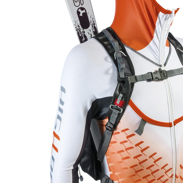 - Shoulder straps: with quick release system, height adjustable, anatomically shaped with soft polyurethane foam lining, covered with breathable mesh fabric, with loops for fixing the drinking system tube and a hook for fixing the ski mount.