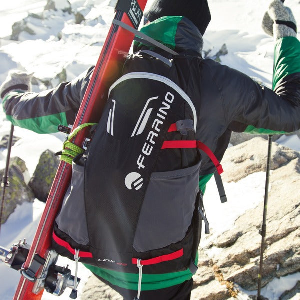 The Ferrino Lynx backpack series is designed primarily for professional ski mountaineering and ski touring competitions, as well as other skiing disciplines and mountaineering. Ferrino Lynx is thought out to the smallest detail and has a number of design features that are unique to these backpacks, such as a specially designed quick-release ski mount, a quick release backpack system, a loop for coupling and, if necessary, towing a second skier, a special compartment for mountaineering crampons and compartments with locks for an avalanche shovel and an avalanche probe. In addition to such specialized design solutions, Ferrino Lynx 25 Black is fully compatible with a hydration system, has a comfortable hip belt and a chest strap with a whistle, is equipped with side compression straps for fixing skis or other equipment, has external loops for carabiners and removable locks for an ice axe and trekking poles. The interior of the backpack is also optimized for placing and fixing various equipment. Small essentials can be placed in open side pockets made of elastic mesh or in a closable pocket on the waist belt. Ferrino Lynx 25 Black has a low weight, thanks to the use of lightweight material, a ventilated back, straps and belt, reflectors on the front, and is also equipped with reliable fittings from the best manufacturers.