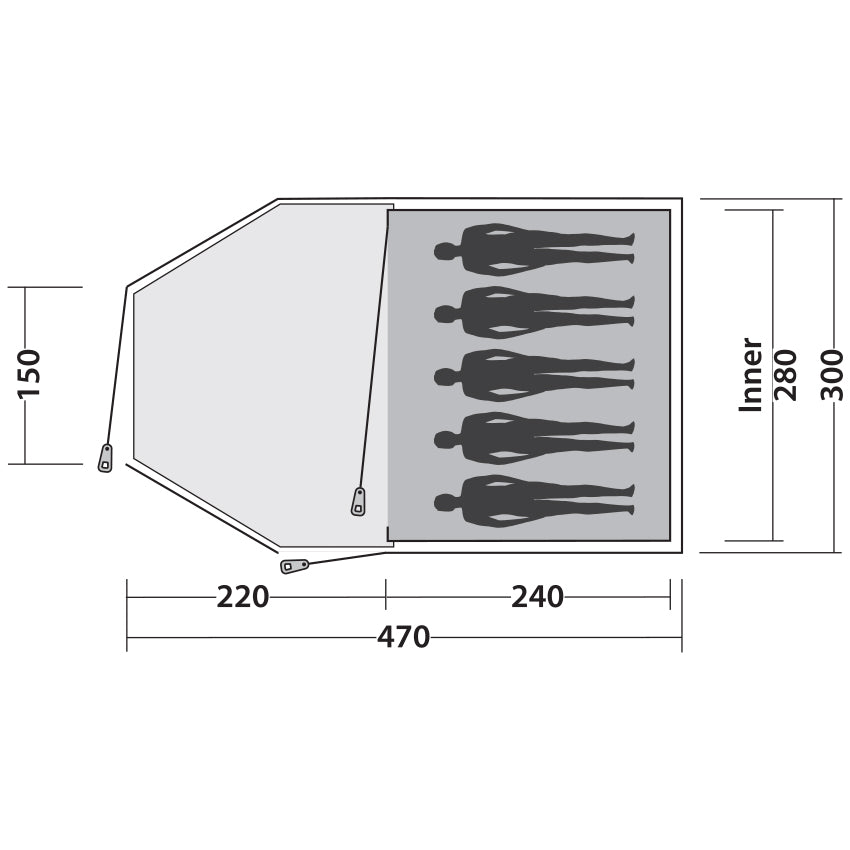 - Inner tent (L x W x H): 240 x 280 x 190 cm