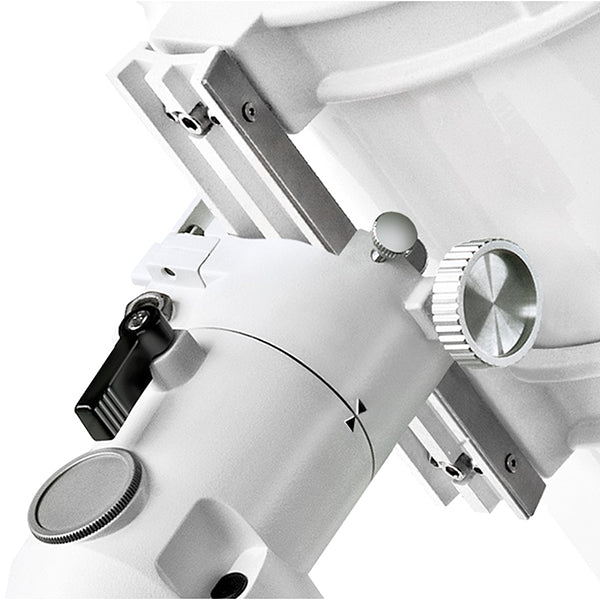 The telescope is equipped with a German equatorial EXOS-2 mount and a stable steel tripod. The tripod is additionally rigidified by a metal shelf for accessories, which has holes for 1.25” and 2” eyepieces. The tripod height is adjustable, which allows the telescope to be adapted to the height of the observer. The EXOS-2/EQ5 mount has a clear design and control system and is capable of carrying a tube weighing up to 13 kg. The fine movement mechanisms on both axes are equipped with flexible, comfortable handles for comfortable control of the telescope in any position of the observer. The mount can be supplemented with a separately purchased electric drive for the right ascension axis and a pole finder to track the daily movement of luminaries without the participation of an observer during visual observations or photography.