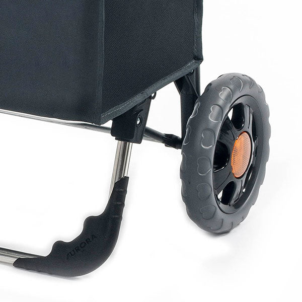 This large Milano carrier bag with a volume of 60 liters is practical, reinforced with an additional hard plastic frame. The top of the bag is covered with a flap with an elegant polypropylene handle for easy opening and closing of the bag. Wide wheels ensure manual handling and stability when paired with a folding footrest. Hand-made, impact-resistant polyurethane handle, paired with lugs for supplementary bags. The wheels are treaded for improved maneuverability on sand and wet ground. A gentleman's bag on wheels is useful to ensure your handiness during shopping, and also to allow the health problems that arise from the pressure on the spine and the heaviness of carrying to disappear. Aurora carrier bags are a 100% Italian product and a perfect solution for comfortable shopping.