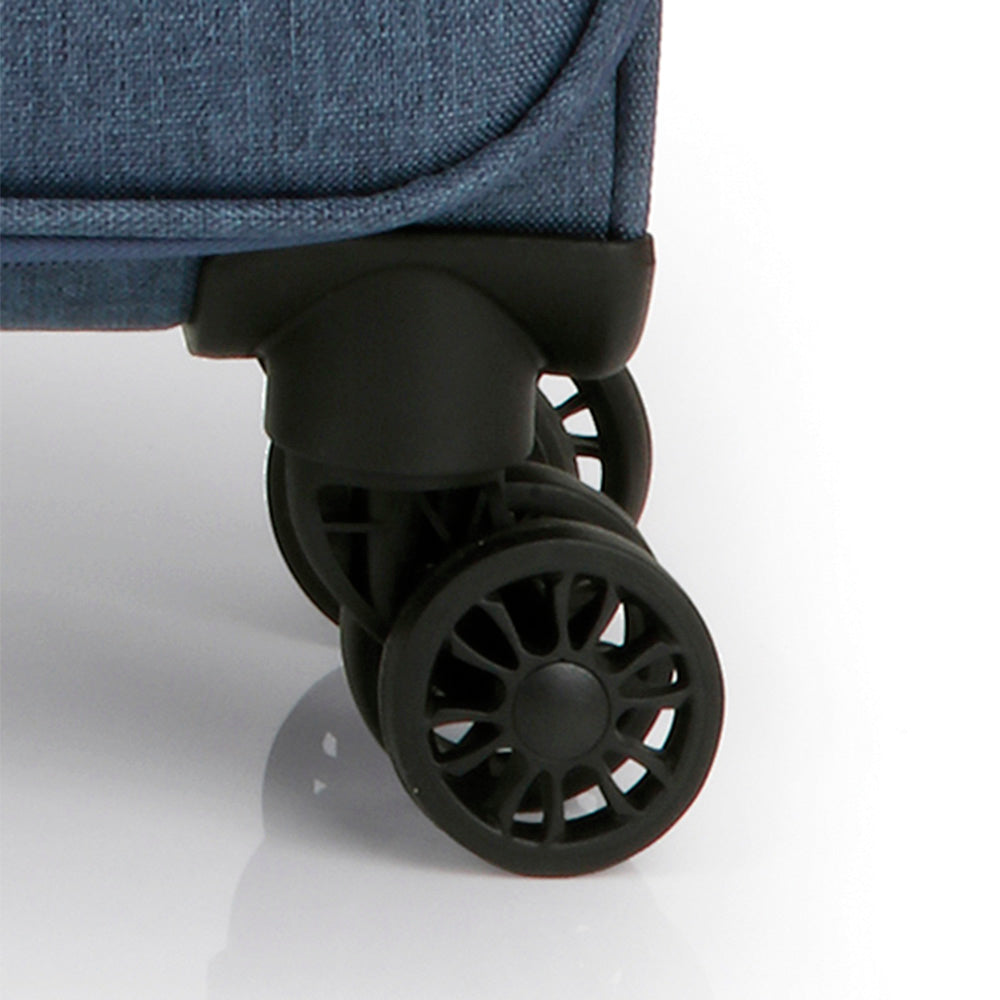 The suitcase is equipped with four paired roller wheels made of high-temperature thermoplastic polyurethane (TPU). The material has a strength comparable to plastic, flexibility of silicone, and also has increased resistance to temperature changes. A distinctive feature of the wheels made of TPU material is the reduction of noise to a minimum when rolling the suitcase on an uneven surface. Due to its resistance to abrasion, the material of the wheels has a long service life.