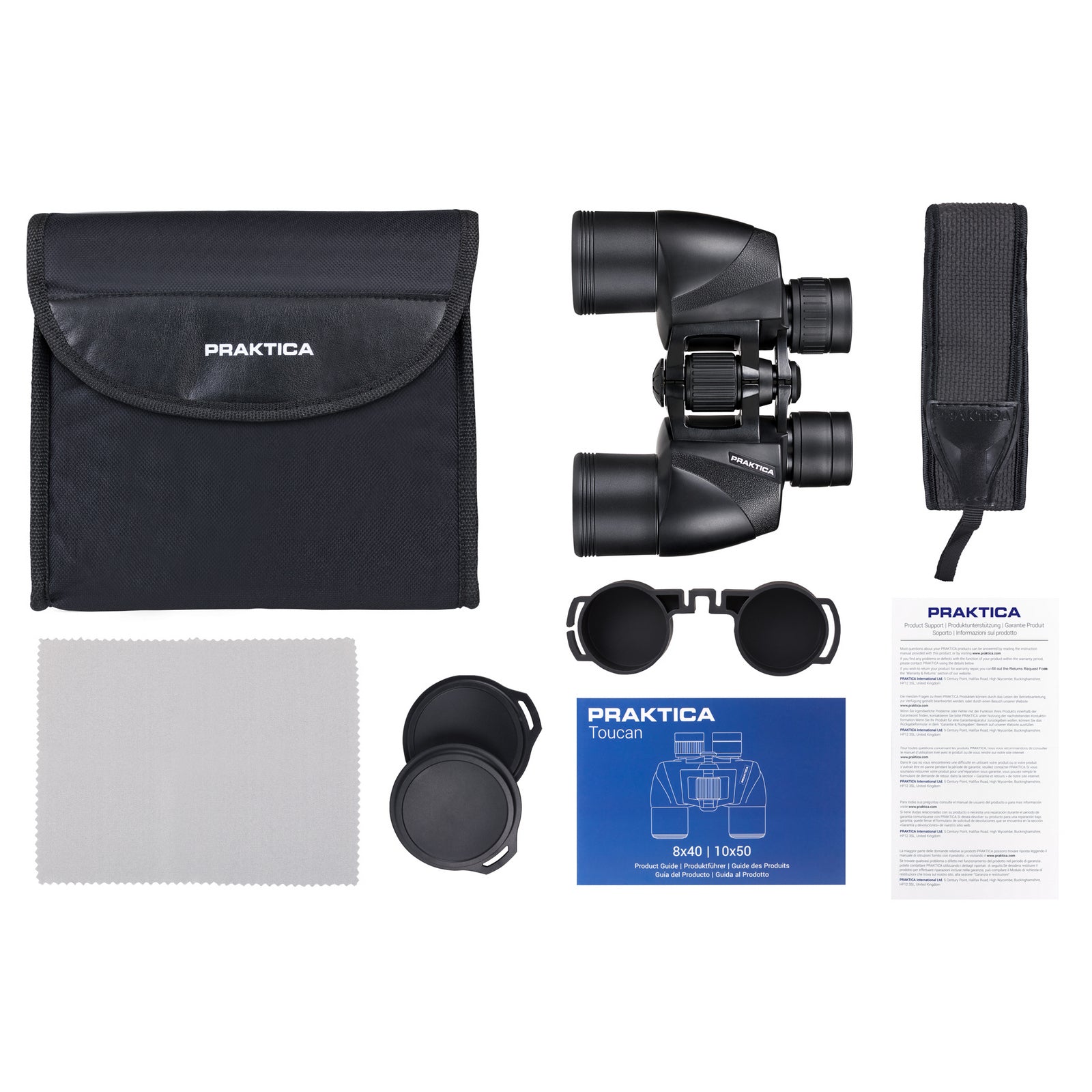 Praktica Toucan 8x40 Binoculars. Despite the popularity of more compact binoculars with Roof prisms, there are many connoisseurs of good optics with a classic Porro prism design, which allows for a more voluminous and clear image. It is for such users that the Praktica Toucan line of binoculars with the most popular magnification and aperture ratio was created. This series uses all the optical components necessary to create a high-quality image. These include BAK4 barite crown prisms, multi-layer enlightenment of each optical surface of the lenses, and wide-angle eyepieces of large diameter, creating significant comfort during observation. These are universal models for hunting, for observing wildlife, landscapes, and city attractions.