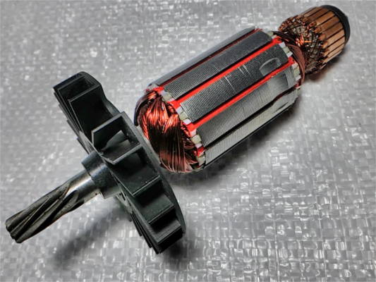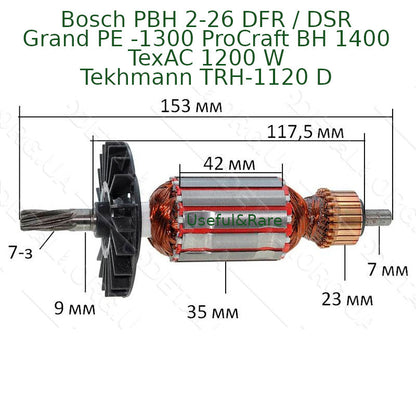 Motor armature for replacement in hammer drill Bosch PBH 2-26 DFR / DSR, Interskol P-26 / 800ER, Elprom EPE-1010, Izhmash IP-1200, Grand PE -1300, Vityaz PE-1350, ProCraft BH 1400, TexAC 1200 W, Tekhmann TRH-1120 D (L153 * d35 7-teeth to the left). 7-tooth left-hand shank, overall length 153, winding package diameter 35, package length 42, commutator diameter 23, rear bearing 7, front bearing 9, distance between bearing positions 113.5 mm