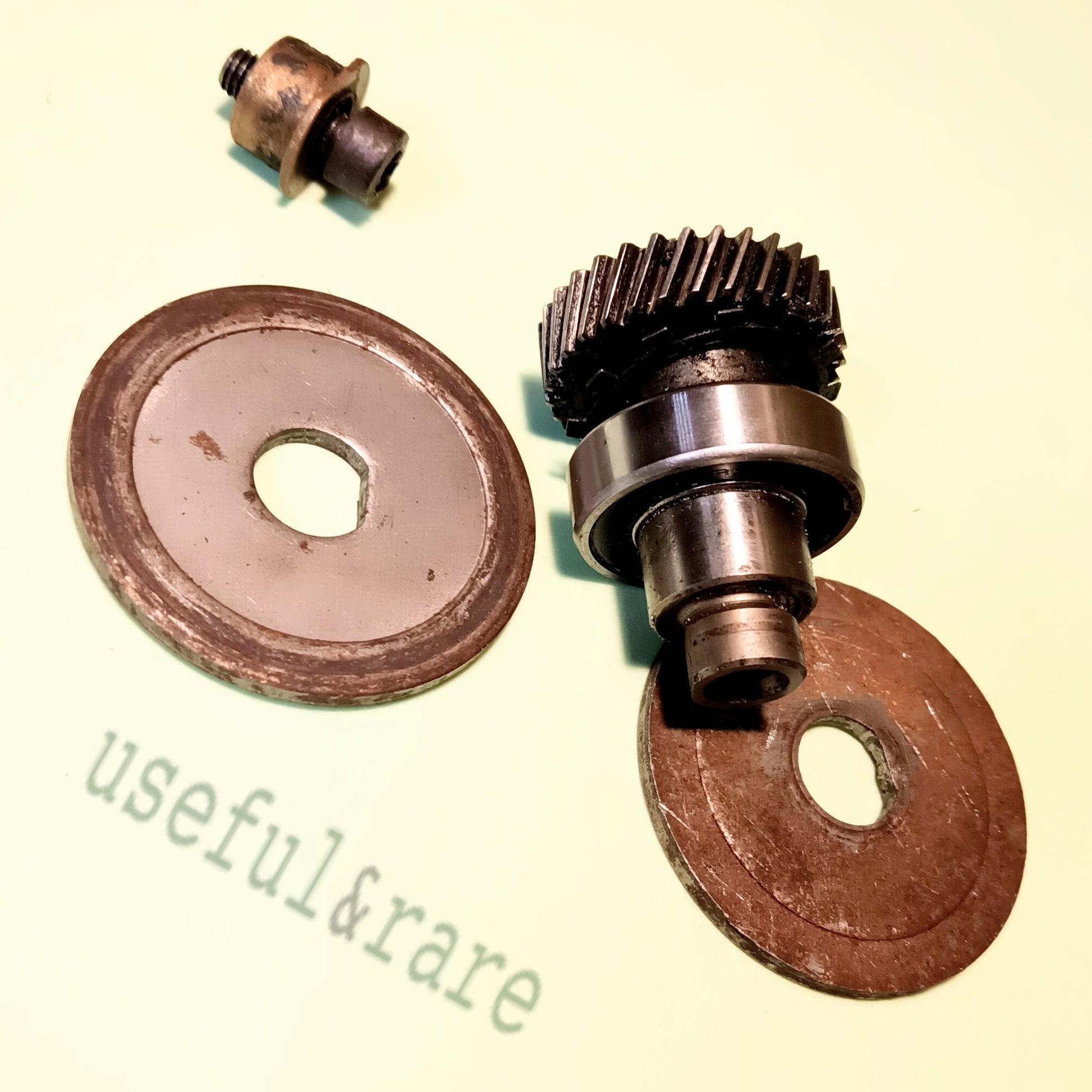 Gearbox unit of a circular electric saw. Shaft length 56 mm, bearing place 6 mm, gear diameter 35 with 31 teeth, bearing diameter 32 mm, diameter of clamping flanges 50 mm