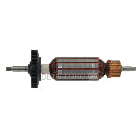 Anchor of the Dewalt angle grinder for 125 circle, shaft length 188 mm; shaft diameter 8 mm, rear bearing - 7 mm; anchor winding diameter - 35 mm; collector - 25 mm; distance between bearings 145 mm; fan ring - 56 mm. The seat is round, the gear is clamped with a nut.