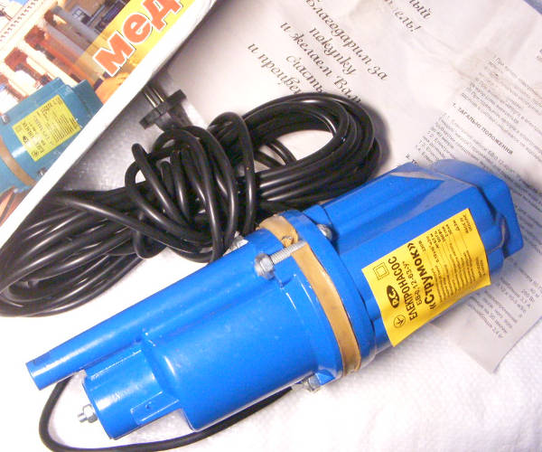 Durable single-valve vibration pump Rucheek with copper electromagnetic coils, upper water intake, for many years of service, nominal pressure 63 meters