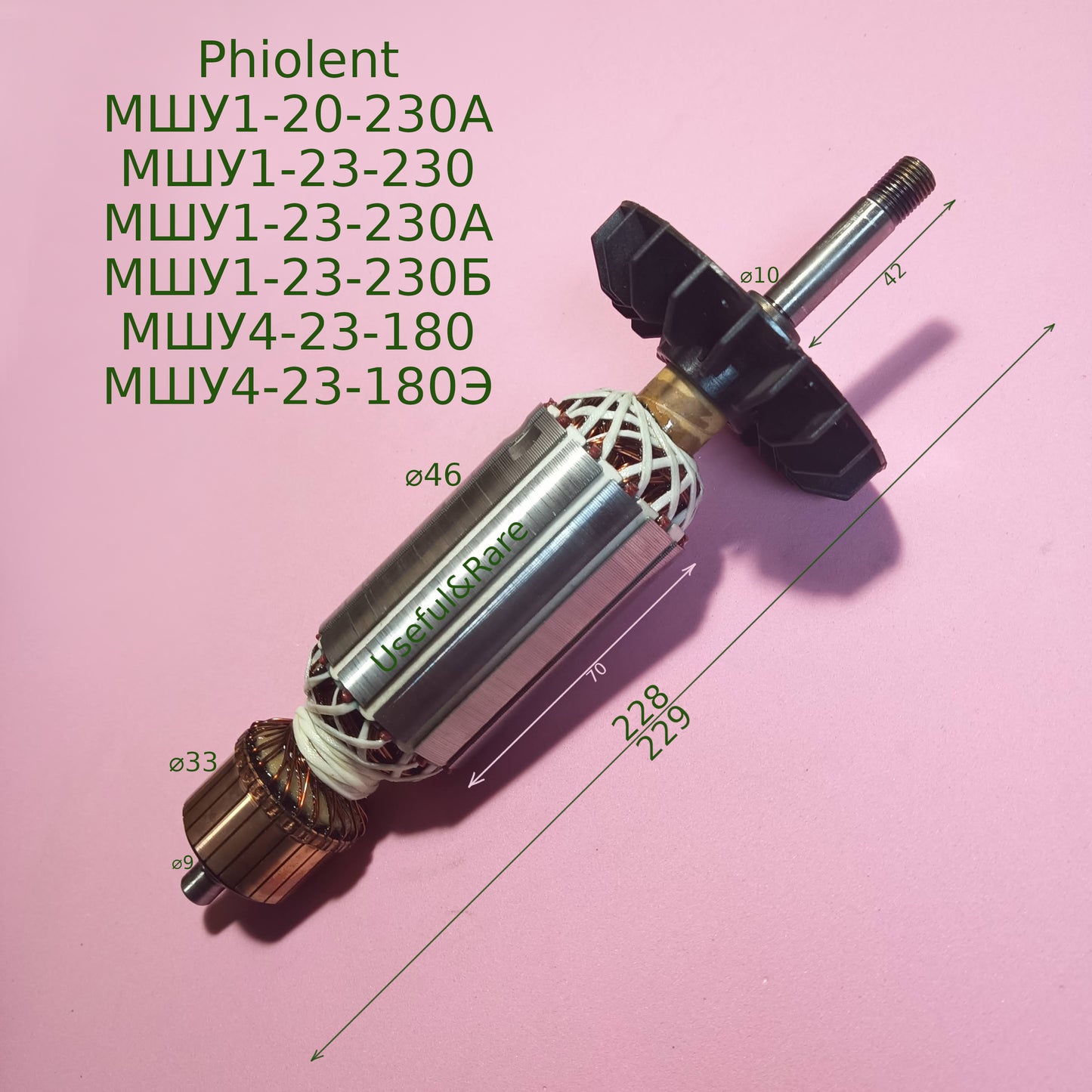 Angler engine motor armature for replace in grinders Fiolent MShU1-20-230A; MShU1-23-230; MShU1-23-230A; MShU1-23-230B; MShU4-23-180; MShU4-23-180E 2000W for 230th circle, size L228-179xd46, bearings fit 10 and 9 mm, thread 10 mm