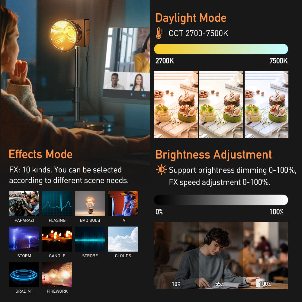 With a color temperature range from a warm 2700K to a cool 7500K, the bi-color and dimmable function of this COB photo lamp allows you to adjust the color temperature and brightness to suit your needs. Whether you are shooting portraits, landscapes or product photography, this lamp provides optimal lighting conditions.