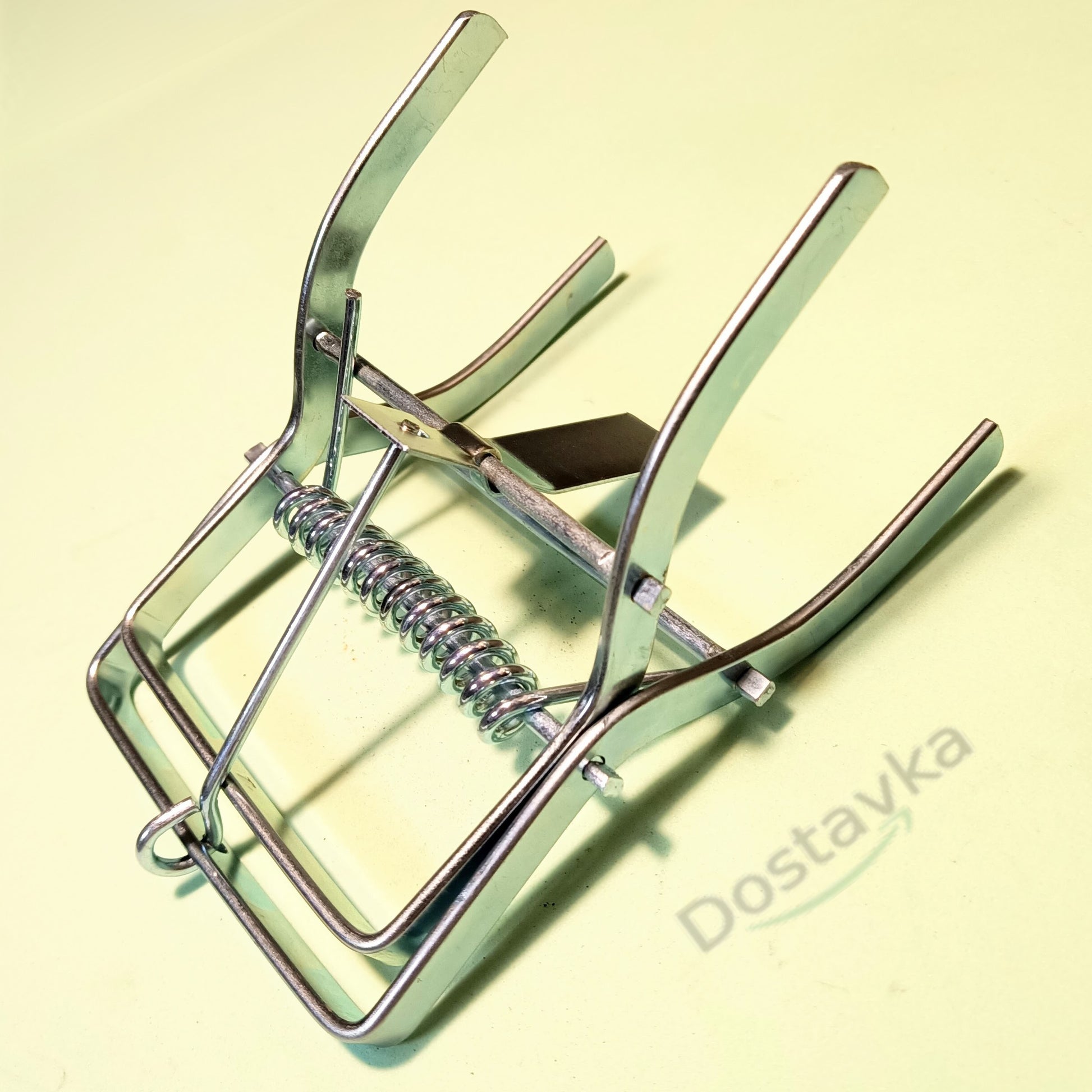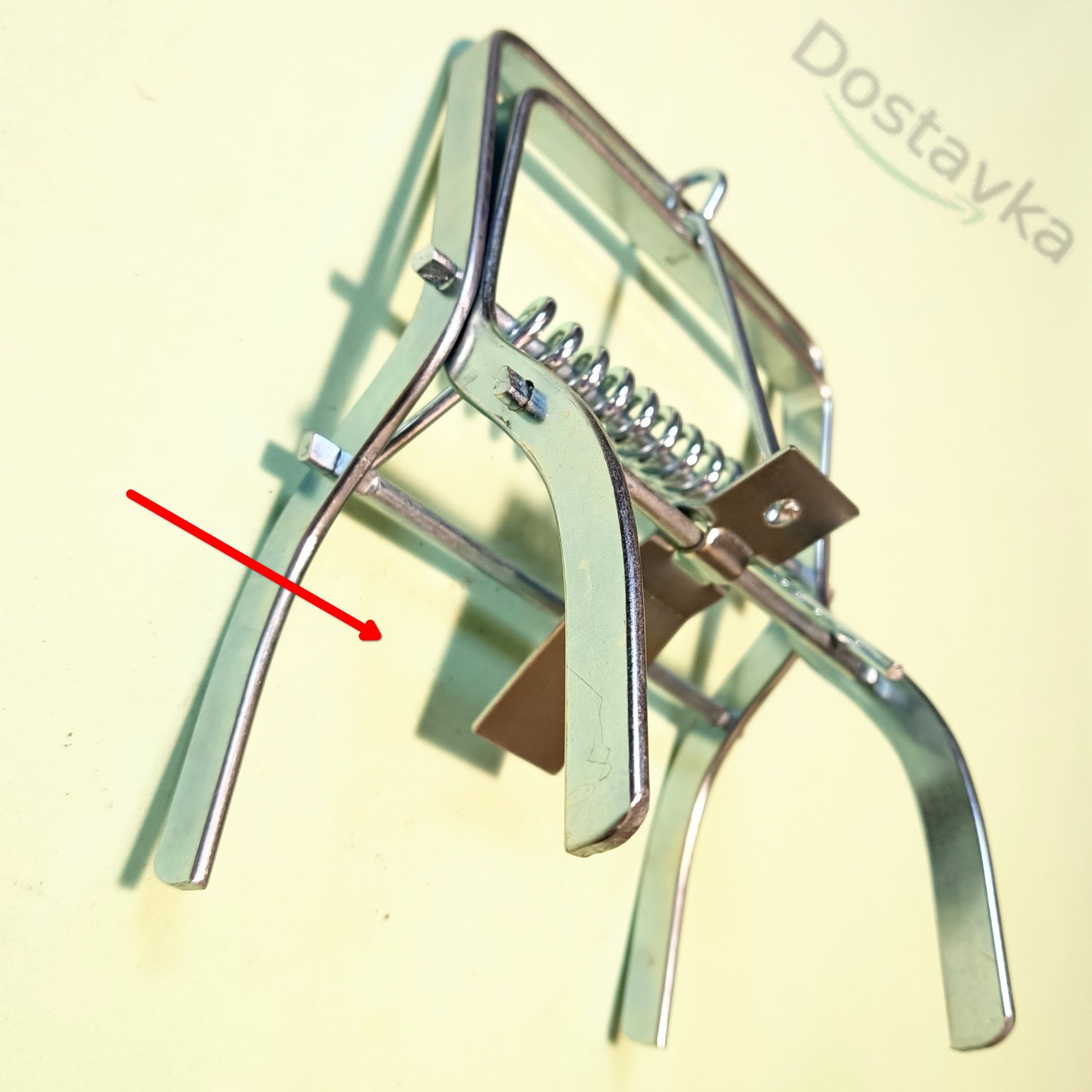 The mole trap operates on the principle of a grappling hook. It is positioned with four legs above and along the burrow, encircling it on both sides. The direction of the rat's tunnel is shown by the red arrow. As the rodent moves along the burrow, it will trigger a sensitive bar that holds the spring in place, causing the grappling hook to snap shut. The distance between the front and rear grips is 90 mm, allowing it to catch only rats and moles longer than 100 mm.